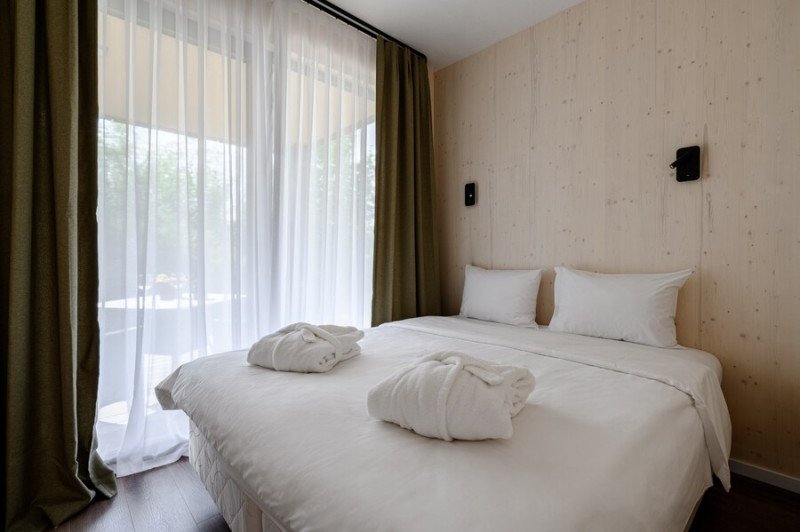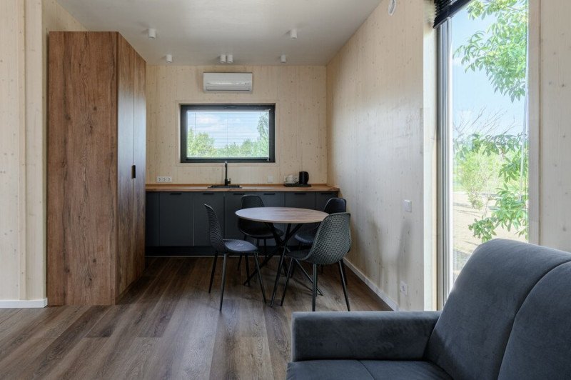 Комфортабельный двухкомнатный коттедж с изолированной спальной комнатой и гостиной с обеденной зоной. Коттедж оснащен современной функциональной мебелью.