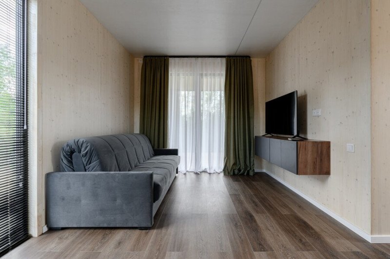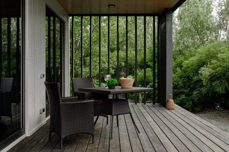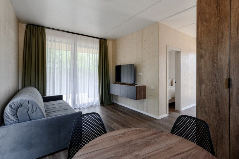 В гостиной расположен диван, который можно использовать как полноценное спальное место. Коттедж оснащен собственной террасой с зоной отдыха.