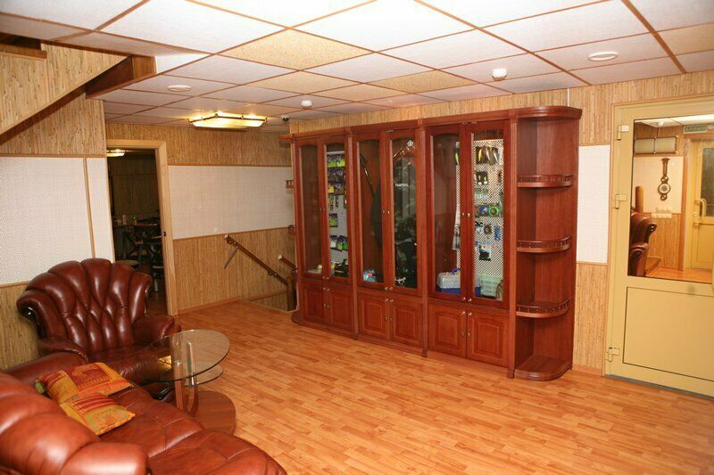Кормовая площадка дебаркадера оборудована шкафчиками для удилищ и прочих снастей. На борту есть сауна с бассейном, своя прачечная и сушка для одежды.