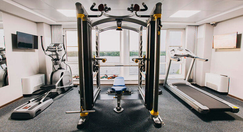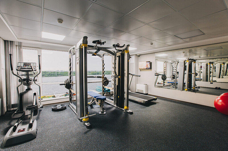 Фитнес-зал расположен на 6 этаже. Из окон зала открывается панорамный вид на Набережную и Волгу.