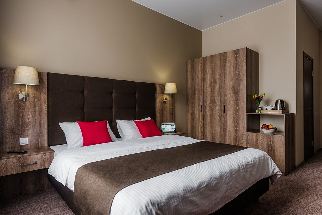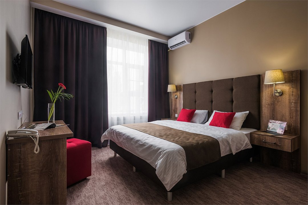 Просторный комфортабельный номер (36 кв. м) со звукоизоляцией. В номере имеется большая двуспальная кровать «king size», собственная ванная комната со всеми необходимыми туалетными принадлежностями и феном. Номер также оборудован системой кондиционирования и вентиляции. Наличие электрочайника, холодильника и ж/к телевизора позволит в полной мере отдохнуть с комфортом. Возможно размещение с младенцем. При необходимости манеж предоставляется бесплатно.Услуги и удобства