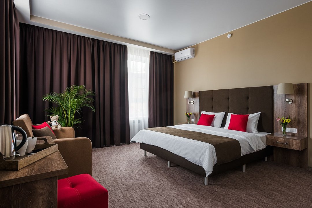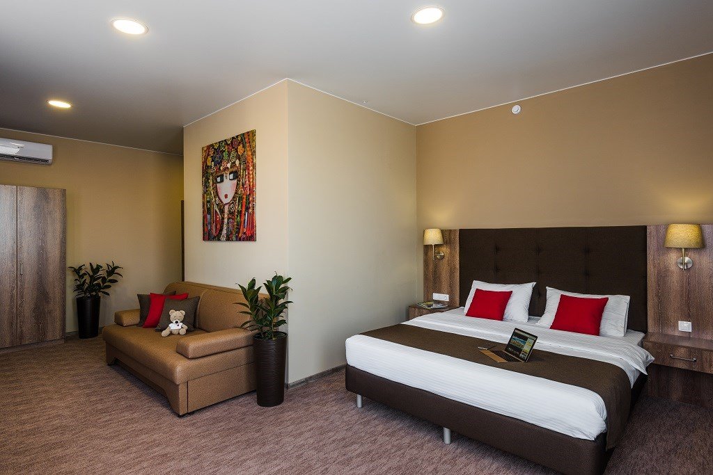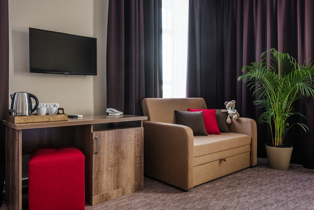 Лучшие номера гостиницы. Просторный (до 40 кв. м), уютный, комфортный номер со звукоизоляцией. Прекрасный вариант для семейного отдыха и деловой поездки. Предлагает большую двуспальную кровать «king size» и отдельную зону с диваном-кроватью и письменным столом. Номер оборудован собственной ванной комнатой со всеми необходимыми туалетными принадлежностями и феном. В номере имеется чайник, ж/к телевизор и холодильник. В жаркие летние дни комфорт обеспечит система кондиционирования и вентиляции воздуха. При размещении с младенцем предоставляется манеж-кроватка бесплатно.Услуги и удобства