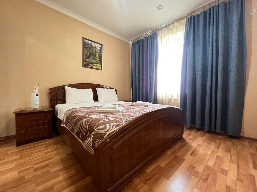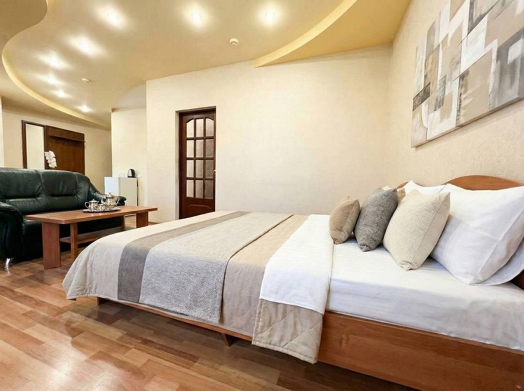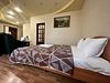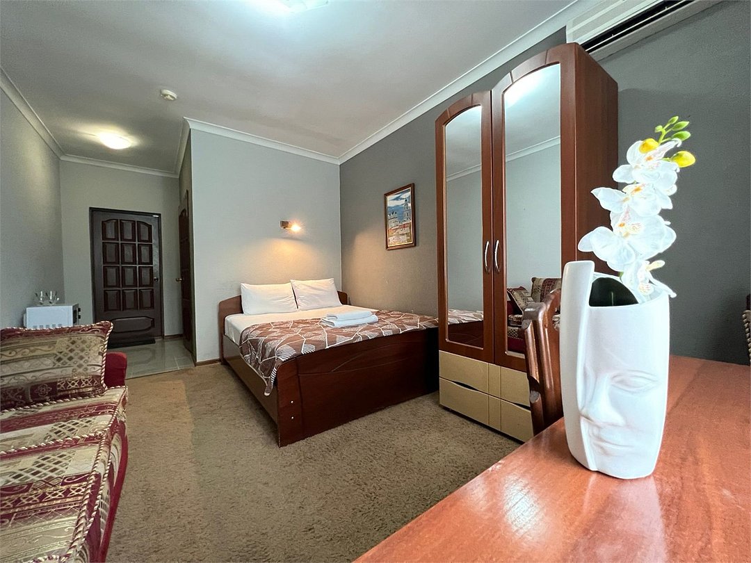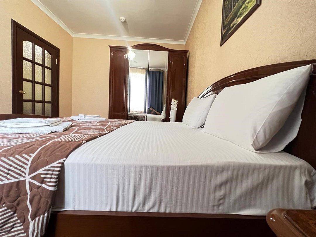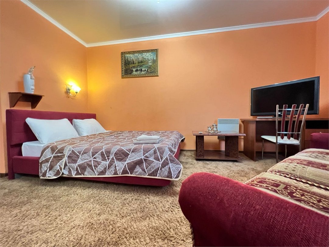 Просторный двухкомнатный номер с большой двухспальной кроватью и комфортным диваном. Идеально подойдет для комфортного размещения семьи из 4-х человек. Есть возможность поставить доп. место. В номере есть все самое необходимое для комфортного проживания: вместительный шкаф и прикроватная тумб, кондиционер, телевизор, холодильник, чайник. Ванная комната оснащена душем, феном. Каждому гостю выдаются по 2 мягких полотенца, гигиенический набор, халат и тапочкиУслуги и удобства