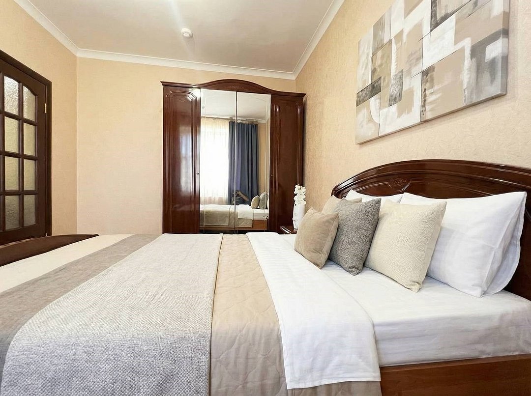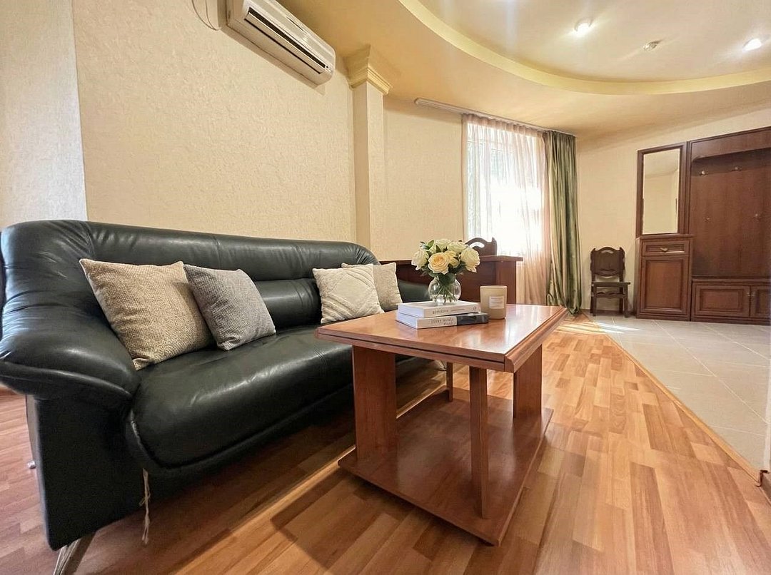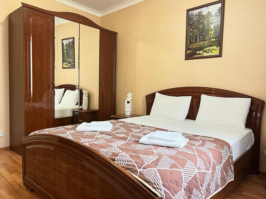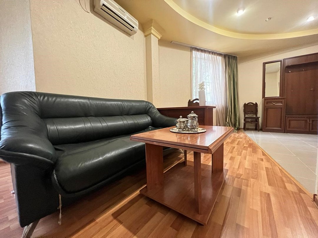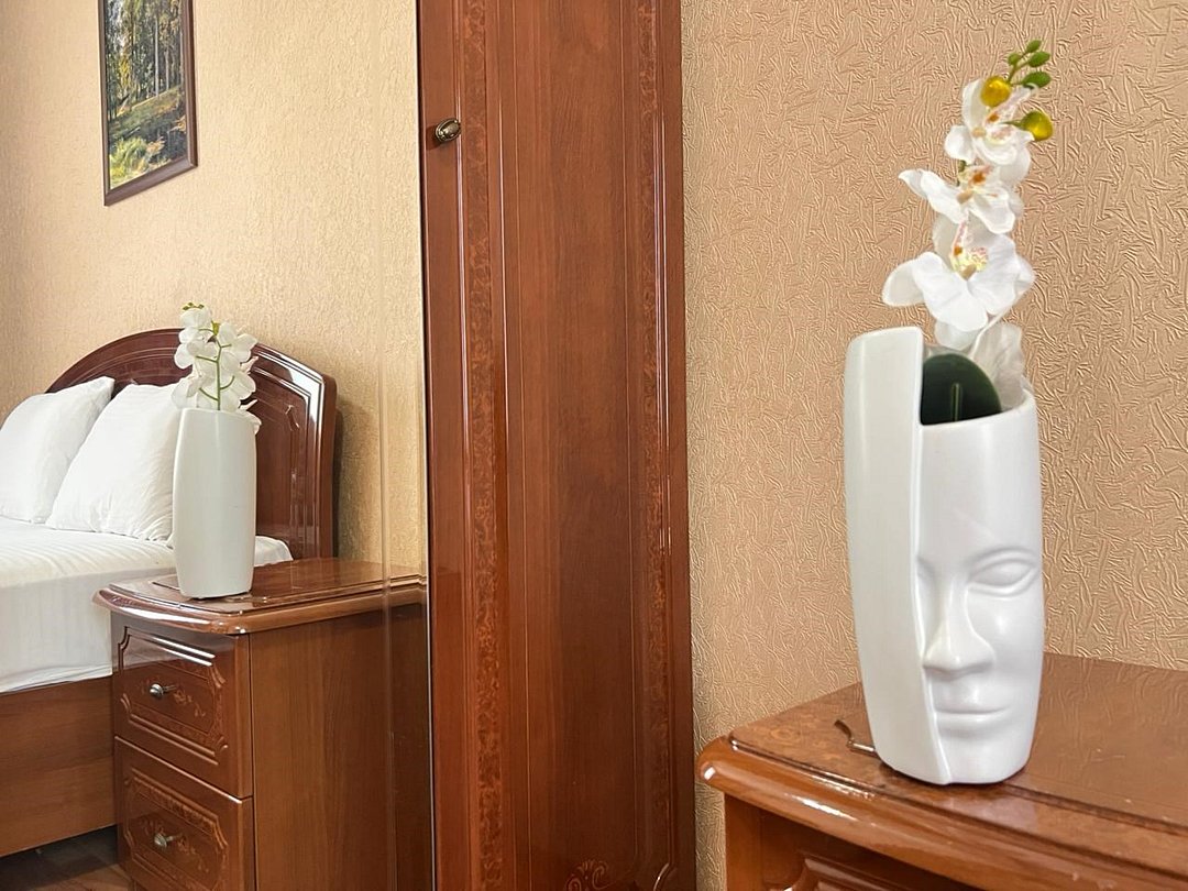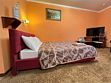 Просторный двухкомнатный номер с большой двухспальной кроватью и комфортным диваном. Идеально подойдет для комфортного размещения семьи из 4-х человек. Есть возможность поставить доп. место. В номере есть все самое необходимое для комфортного проживания: вместительный шкаф и прикроватная тумб, кондиционер, телевизор, холодильник, чайник. Ванная комната оснащена душем, феном. Каждому гостю выдаются по 2 мягких полотенца, гигиенический набор, халат и тапочкиУслуги и удобства