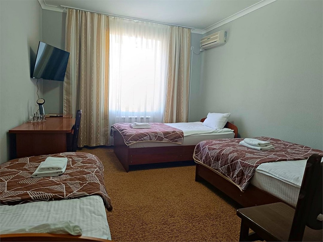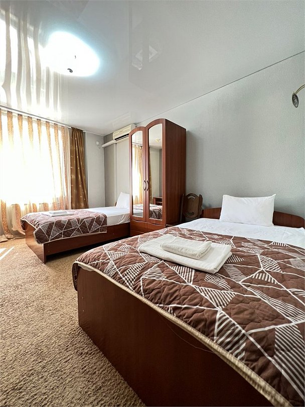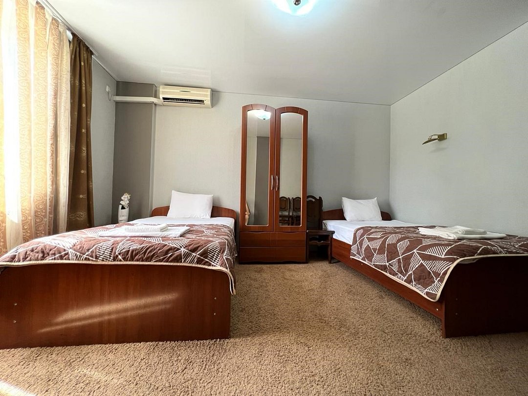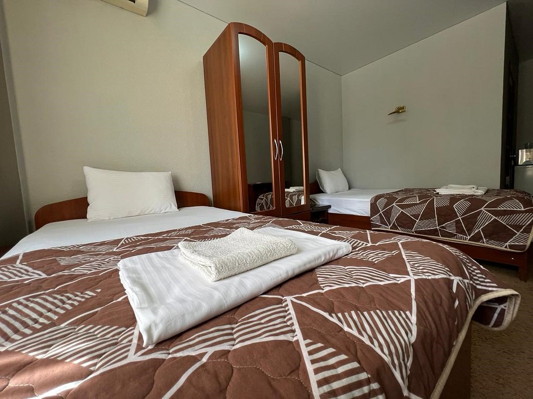 Вместительный трехместный номер с тремя раздельными кроватями (альтернативный вариант большая двухспальная кроватью и односпальная) заправленные чистым постельным бельем. В номере есть все самое необходимое для комфортного проживания: вместительный шкаф и прикроватная тумба, кондиционер, телевизор, холодильник. Ванная комната оснащена душевой кабиной, феном. Каждому гостю выдается мягкое полотенце и гигиенический наборУслуги и удобства