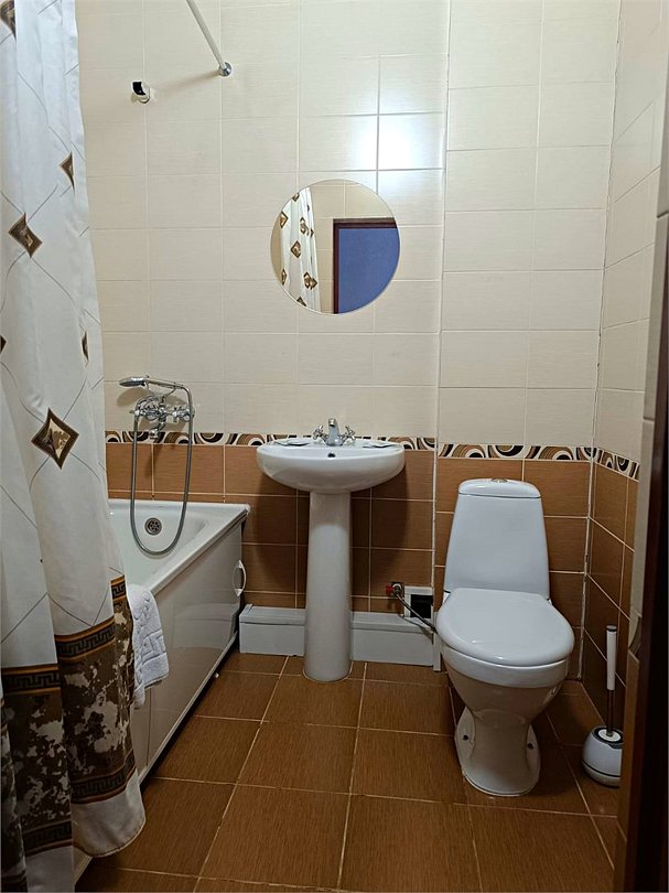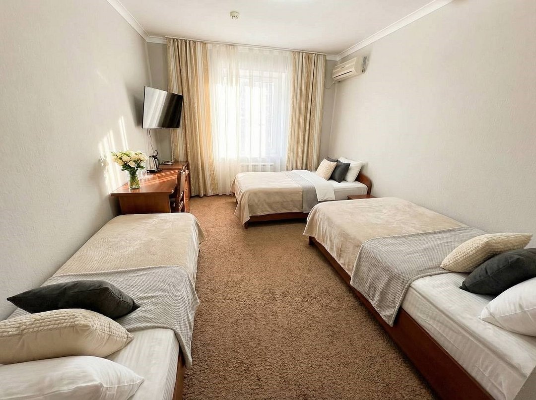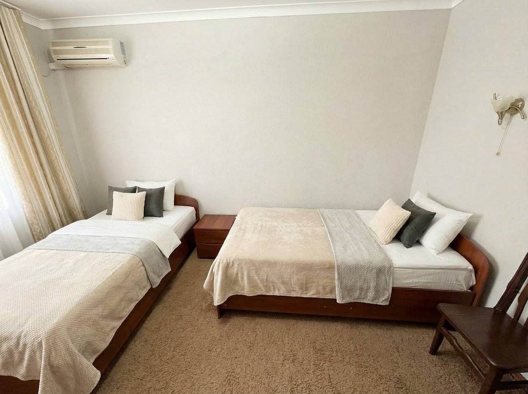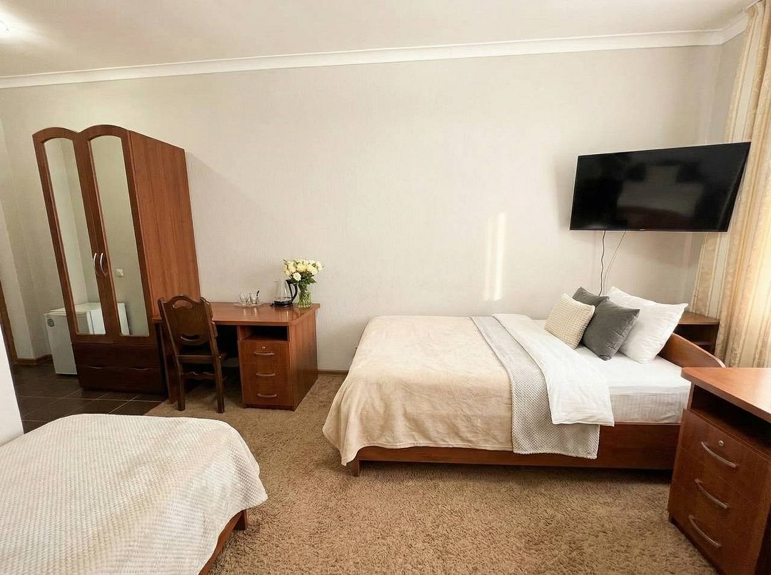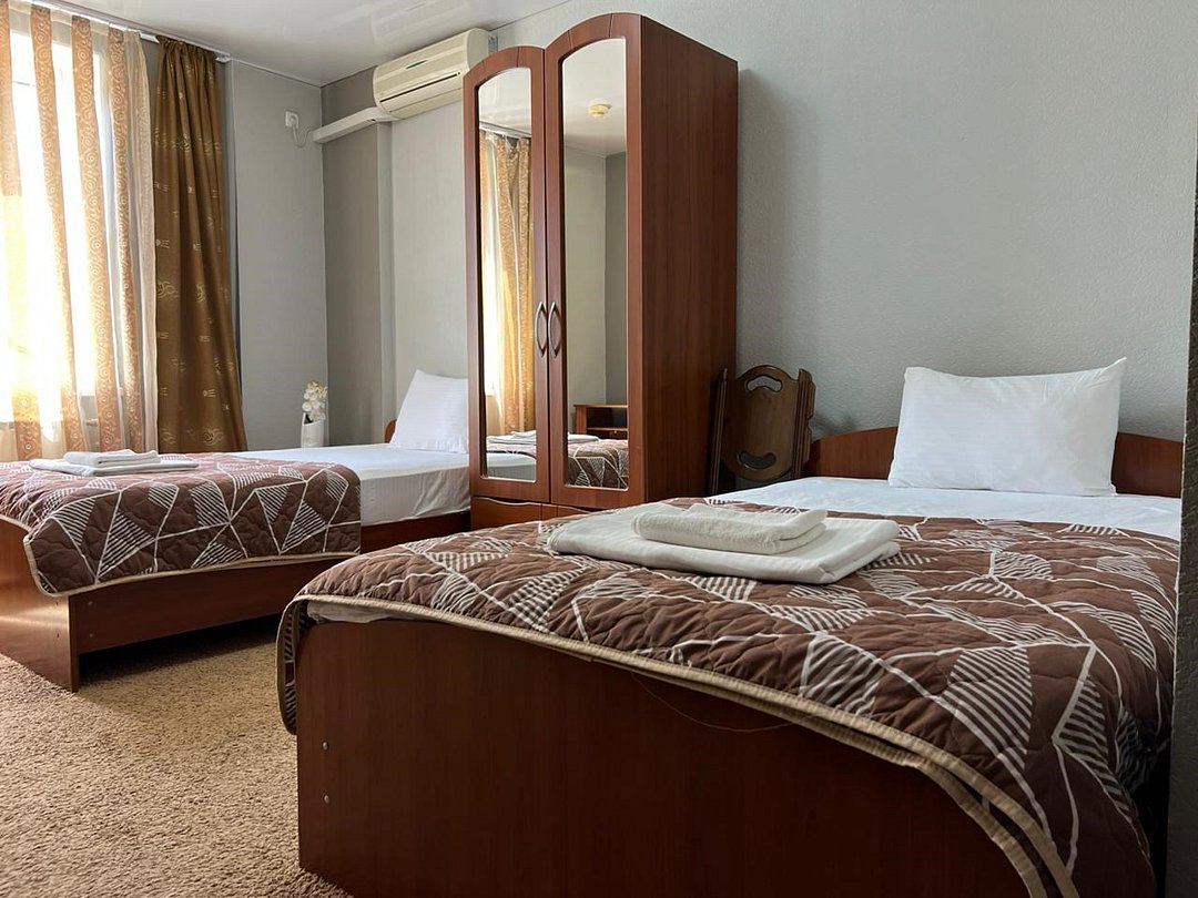 Вместительный трехместный номер с тремя раздельными кроватями (альтернативный вариант большая двухспальная кроватью и односпальная) заправленные чистым постельным бельем. В номере есть все самое необходимое для комфортного проживания: вместительный шкаф и прикроватная тумба, кондиционер, телевизор, холодильник. Ванная комната оснащена душевой кабиной, феном. Каждому гостю выдается мягкое полотенце и гигиенический наборУслуги и удобства