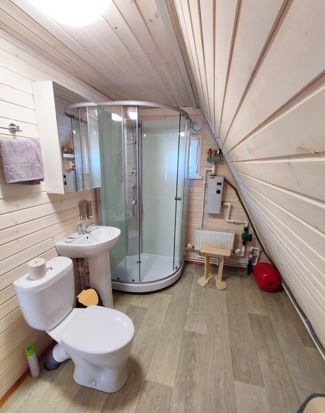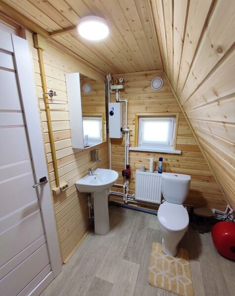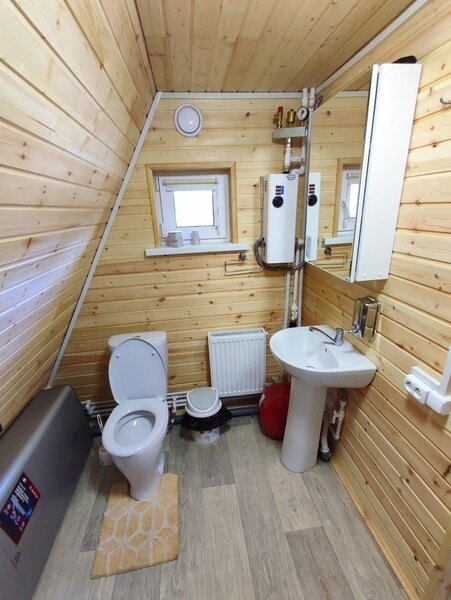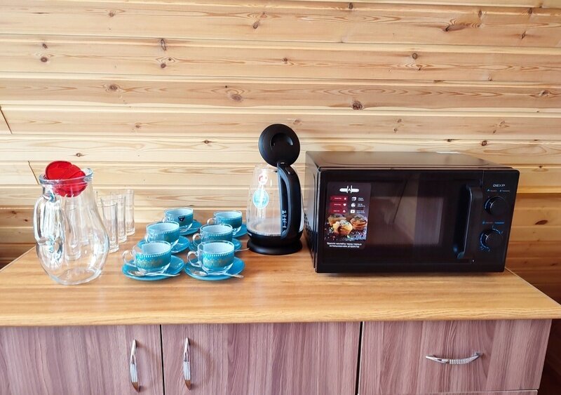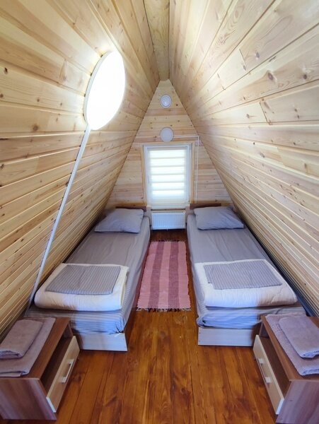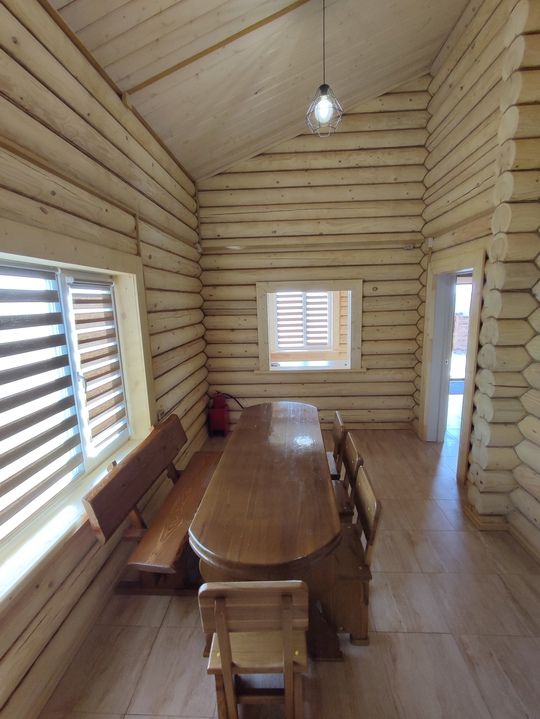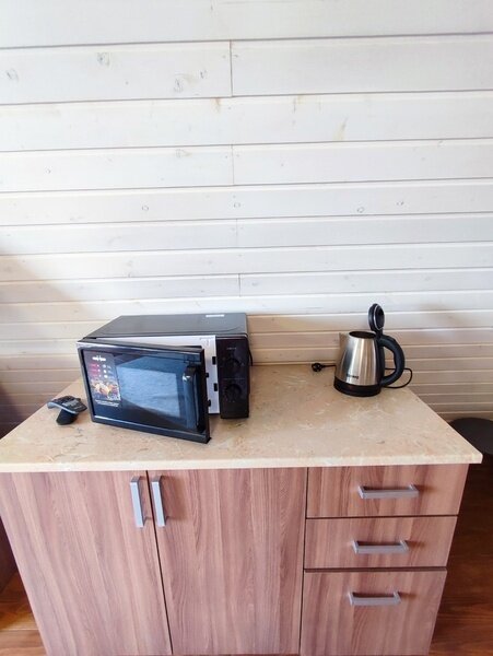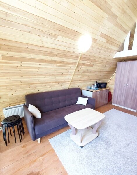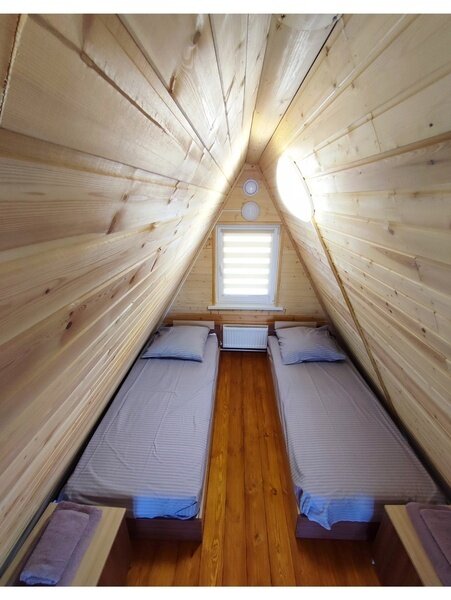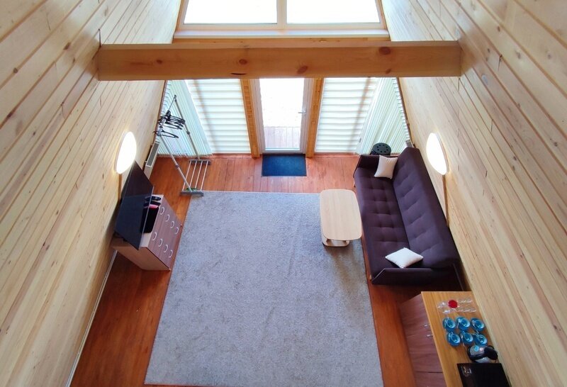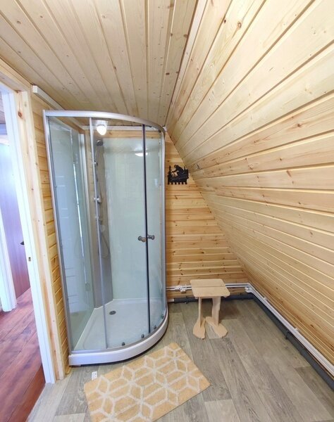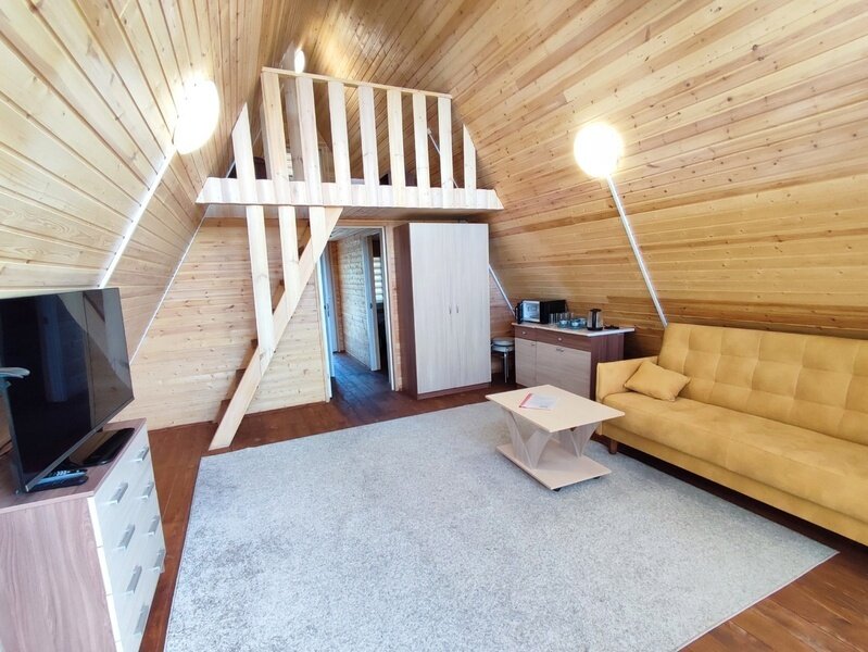 2-х этажный дом рассчитан для проживания до 6 человек. На первом этаже расположены: спальня, санузел + душевая, просторная гостиная с большим диваном, ТВ, обеденной зоной. На втором расположены 2 кровати. В домике есть чайник, микроволновая печь, посуда для чаепития, постельные принадлежности, полотенца. Возле домика обустроена своя мангальная зона.