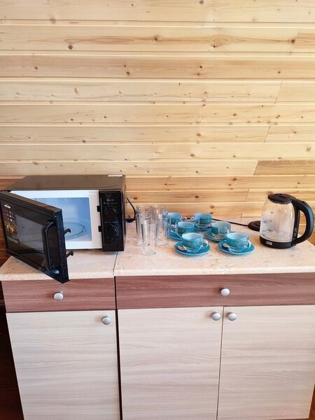 2-х этажный дом рассчитан для проживания до 8 человек. На первом этаже расположены: спальня, санузел + душевая, просторная гостиная с большим диваном, ТВ. На втором расположены 2 кровати. В домике есть чайник, микроволновая печь, посуда для чаепития, постельные принадлежности, полотенца. Возле домика обустроена своя мангальная зона.