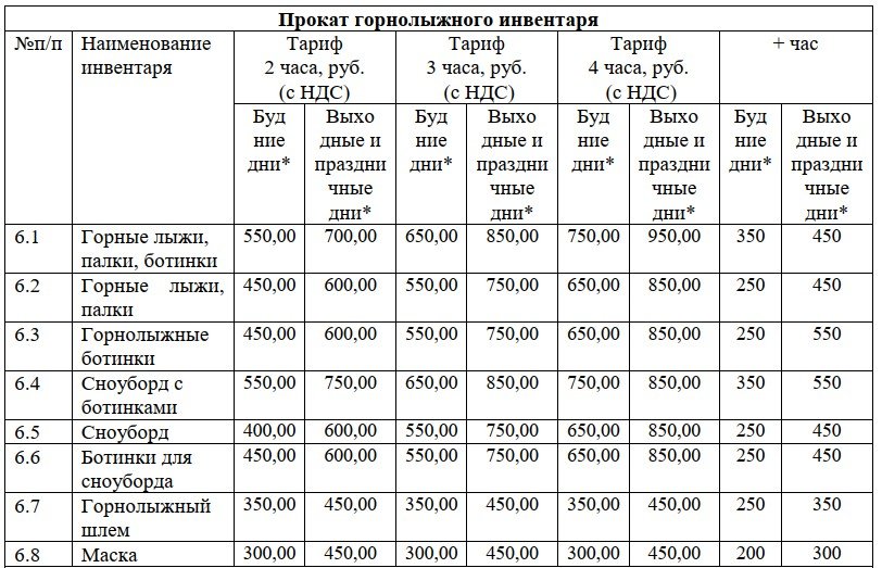 - Сноуборд и ботинки — 550 ₽ / 2 часа (будни), 750 ₽ / 2 часа (выходные), 650 ₽ / 3 часа (будни), 850 ₽ / 3 часа (выходные), 750 ₽ / 4 часа (будни), 850 ₽ / 4 часа (выходные). Дополнительный час — 350 ₽ (будни), 550 ₽ (выходные).