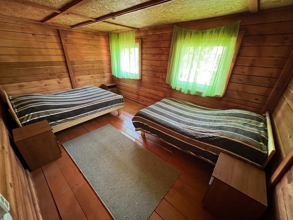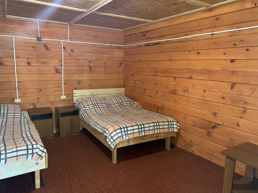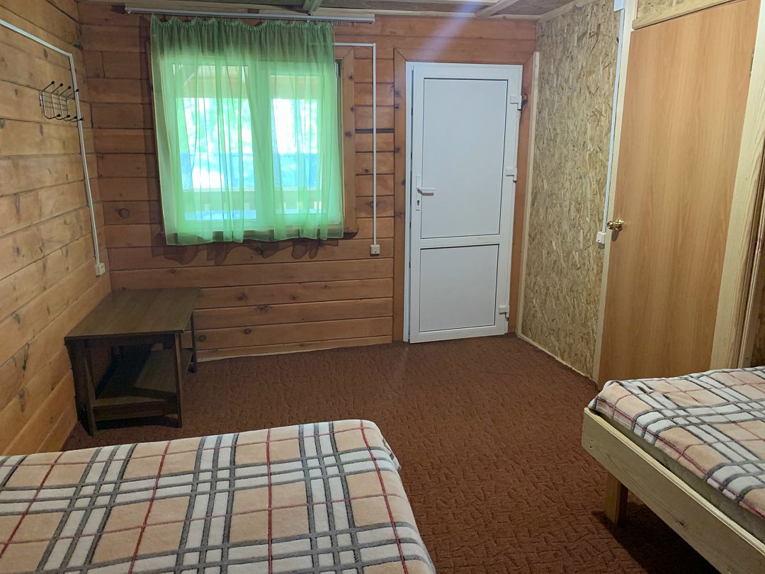2 этаж в 2-х этажном корпусе из бруса. В номере две 1,5 спальных кровати, стол, тумба. Туалет и душ на территории.