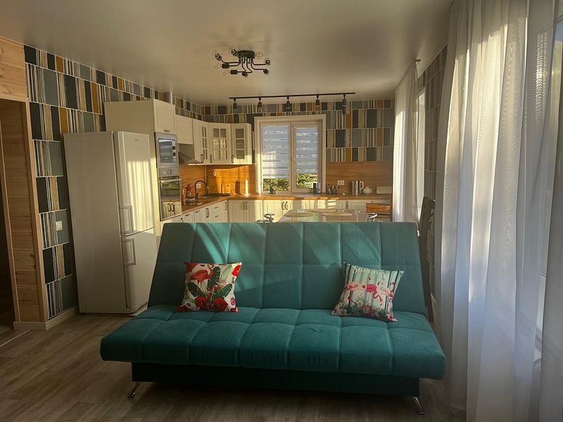 В доме 3 спальни и общая кухня-гостиная. Дом рассчитан на 6 человек + 3 дополнительных места (раскладной диван двухместный + раскладное кресло на человека).