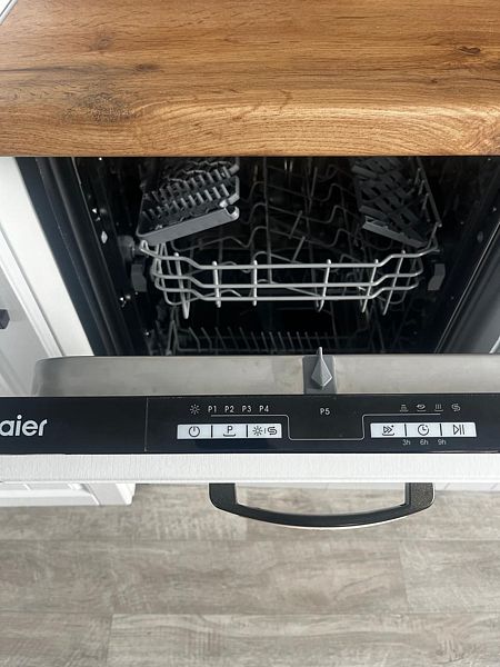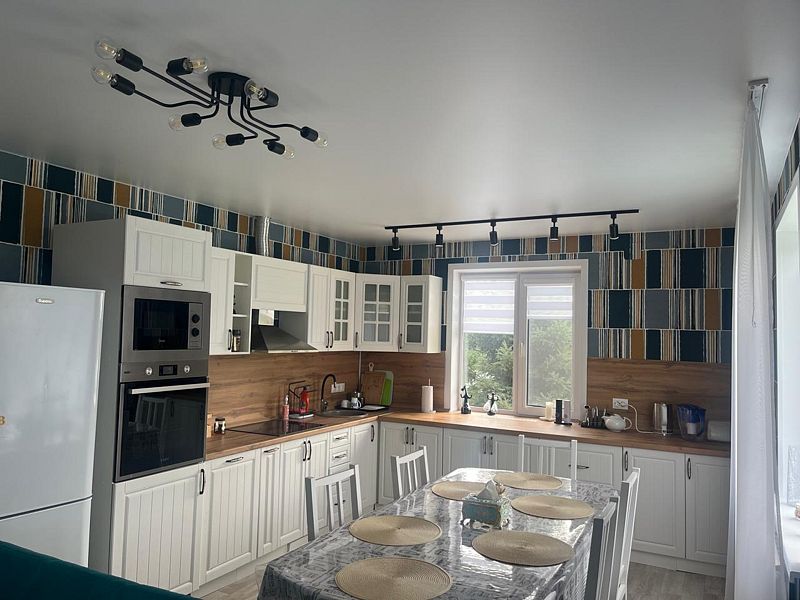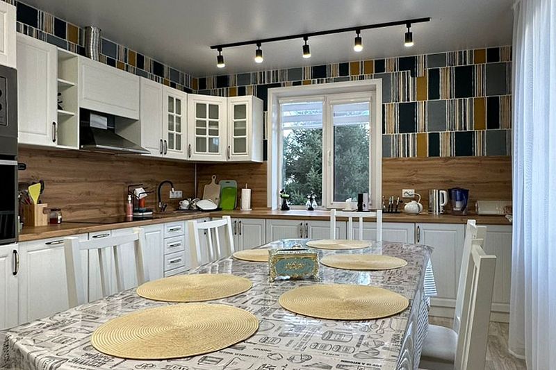 Кухня — настоящая находка для гурманов. Она полностью оснащена всем необходимым для комфортного приготовления пищи: индукционная плита, духовой шкаф, посудомоечная машина. Здесь есть просторная столешница, много шкафчиков и яркий фартук.