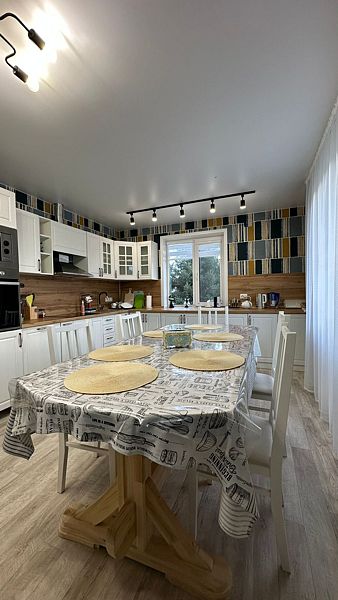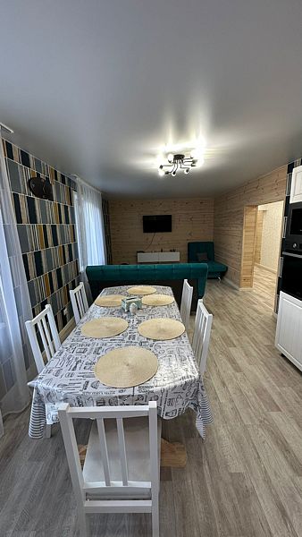 Гостиная — сердце дома. Здесь можно собраться компанией из 9 человек, будь то семья или друзья. Гостиная оборудована удобным мягким диваном, где можно отдохнуть и провести время в кругу близких. Большие окна в гостиной пропускают много света и создают ощущение простора.