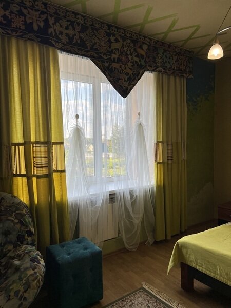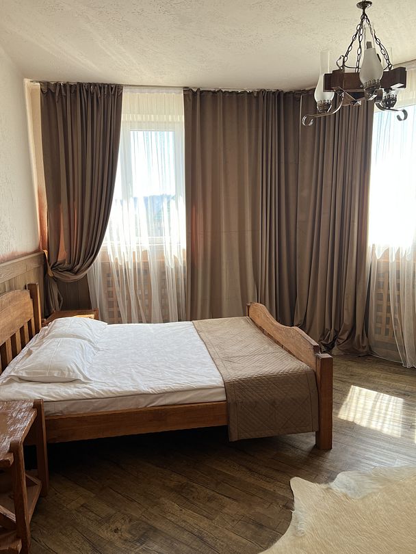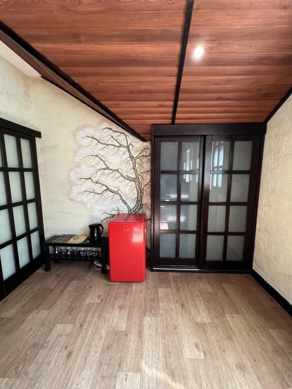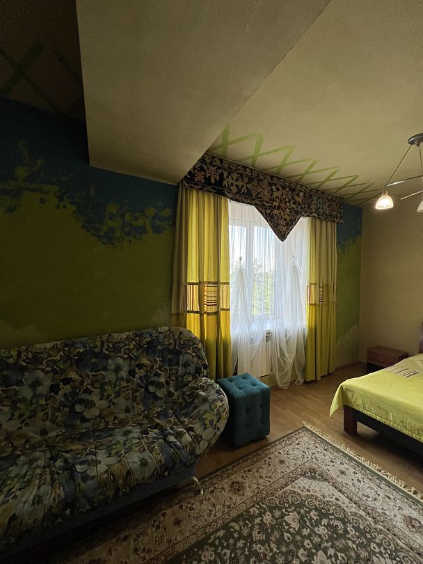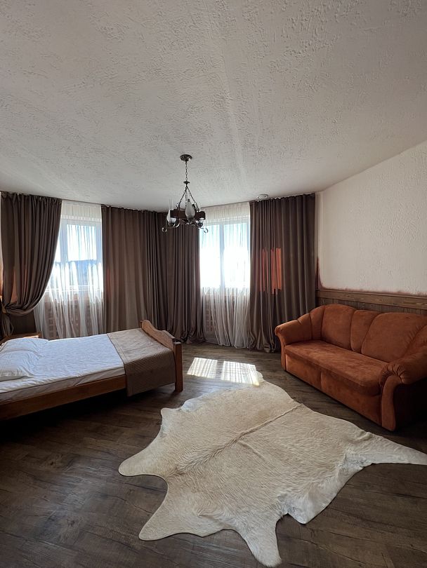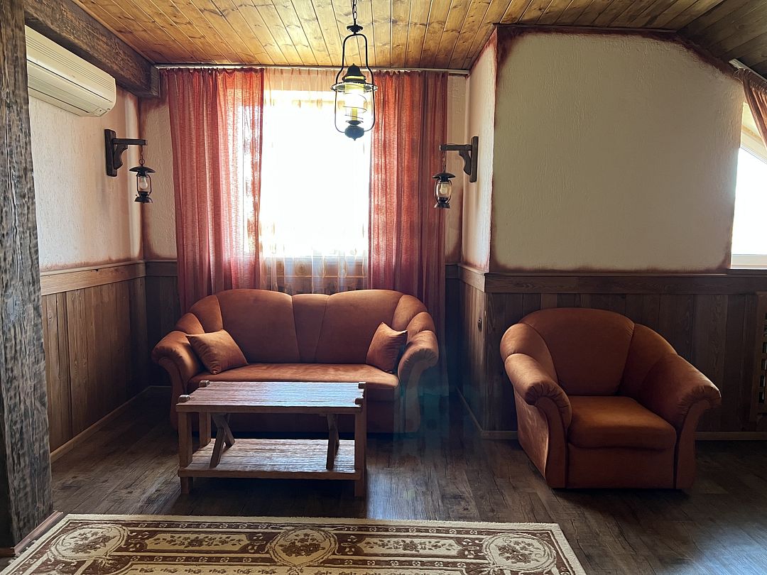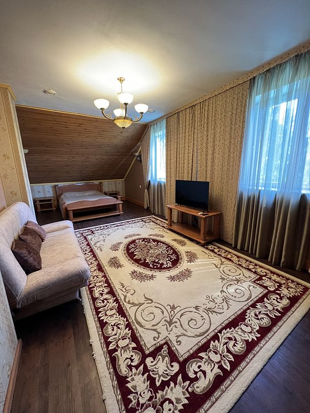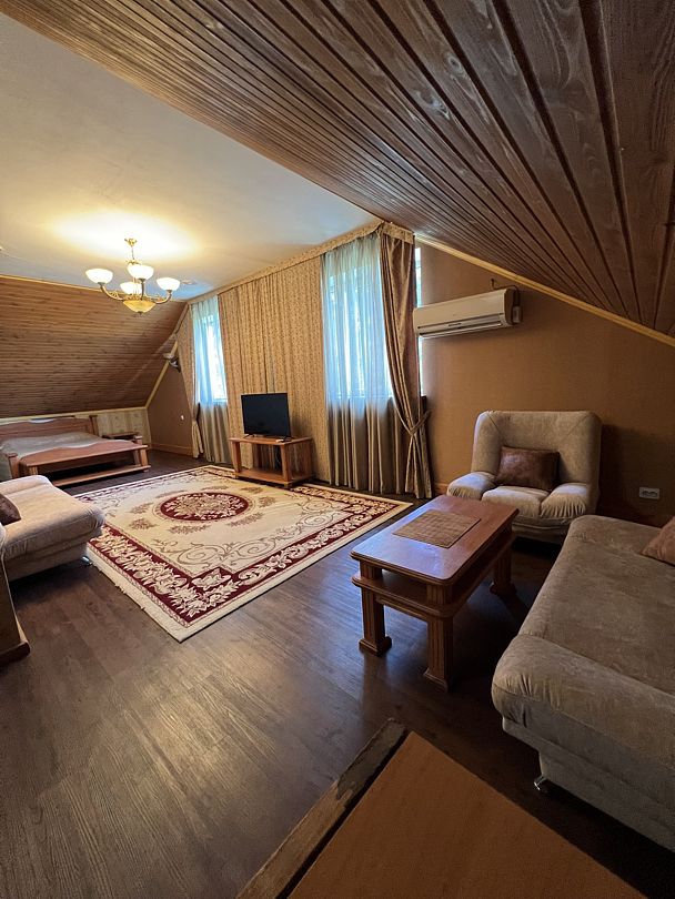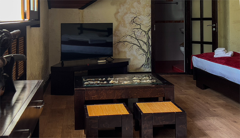 В спальной комнате стеклянная люстра — попугай. Межкомнатная дверь. В номере двуспальная кровать, диван 140 см. Чайная комната — в холле на 2 этаже.