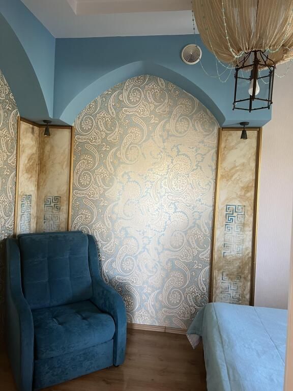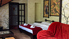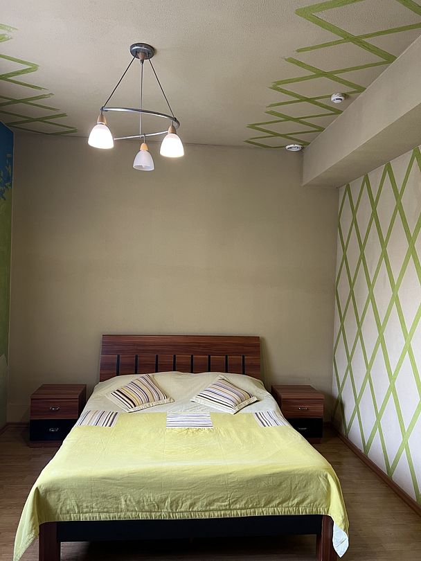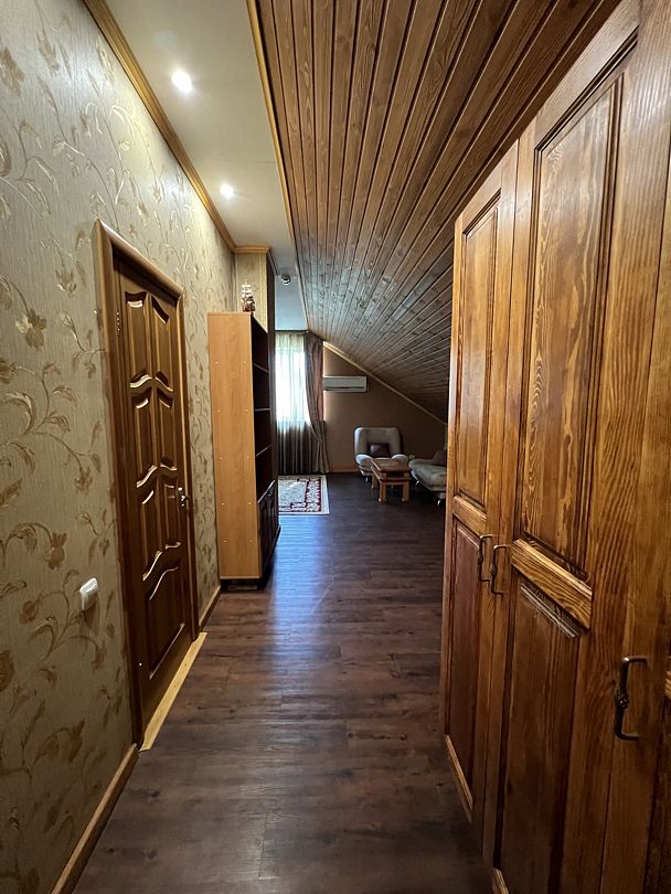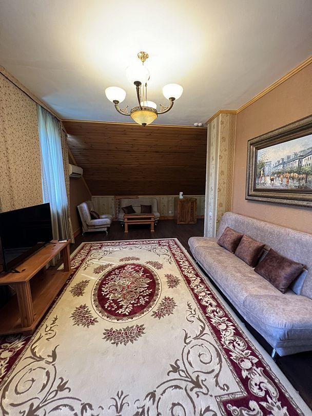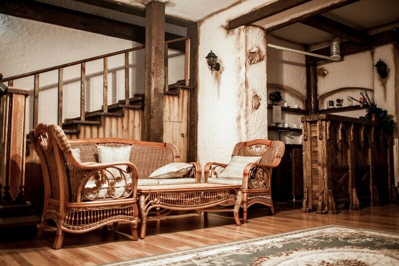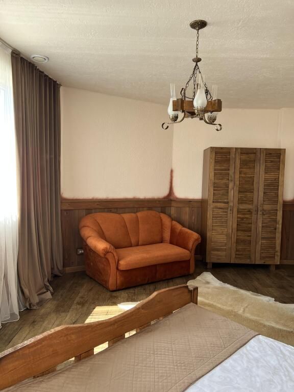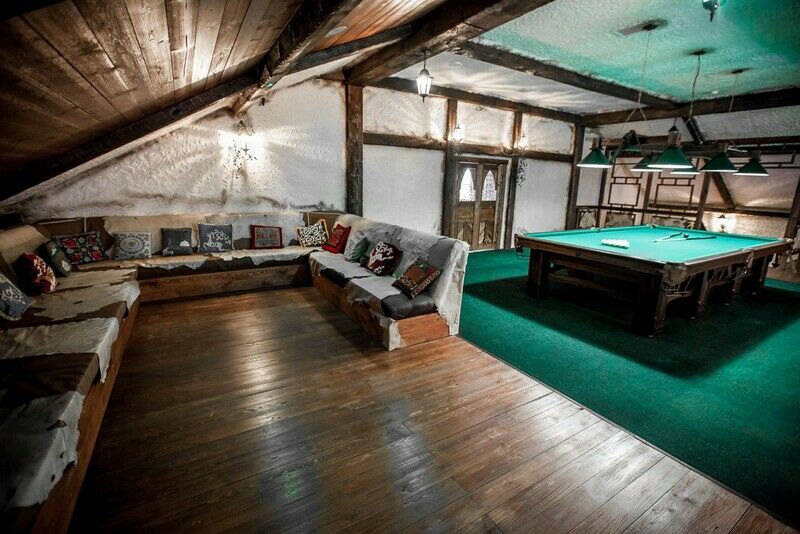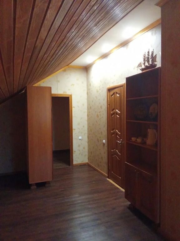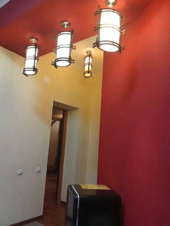 В спальной комнате стеклянная люстра — попугай. Межкомнатная дверь. В номере двуспальная кровать, диван 140 см. Чайная комната — в холле на 2 этаже.