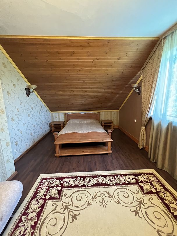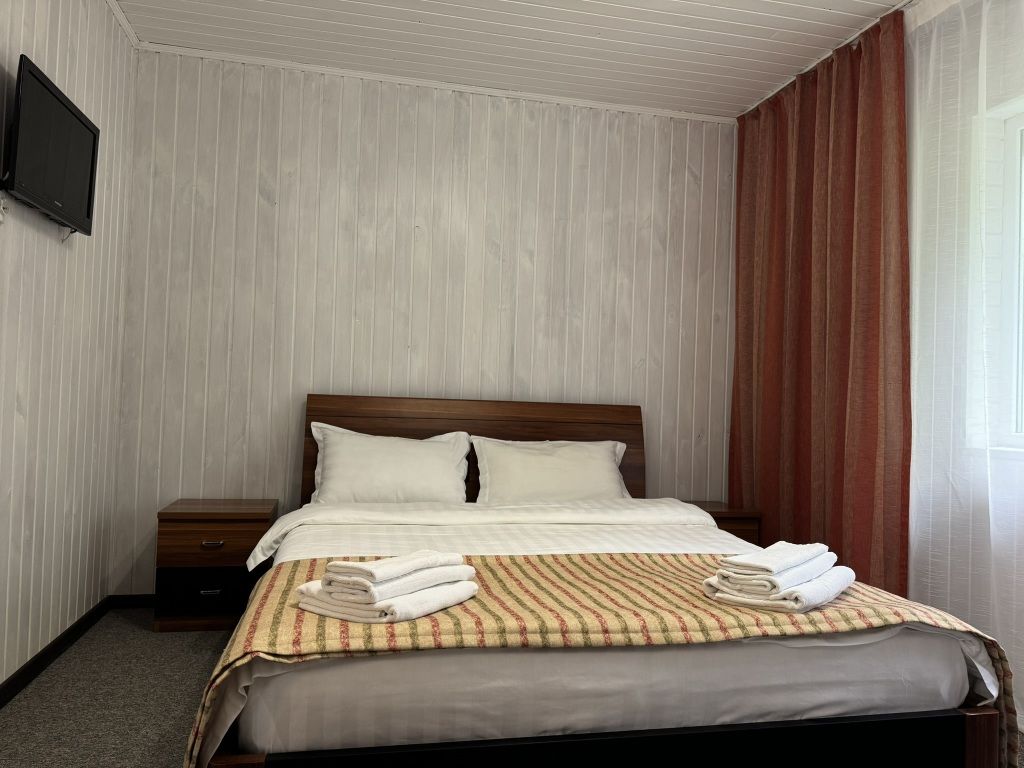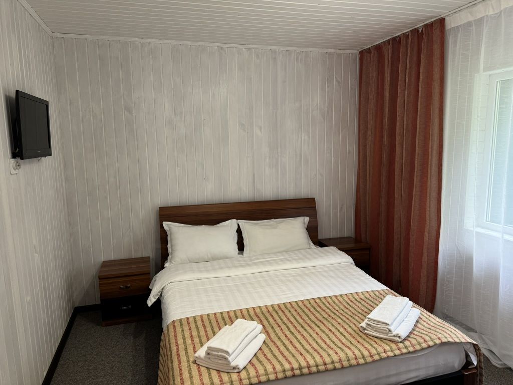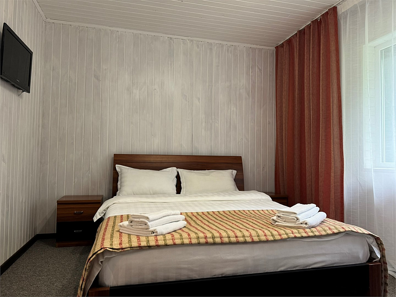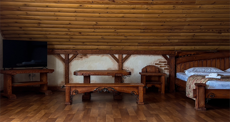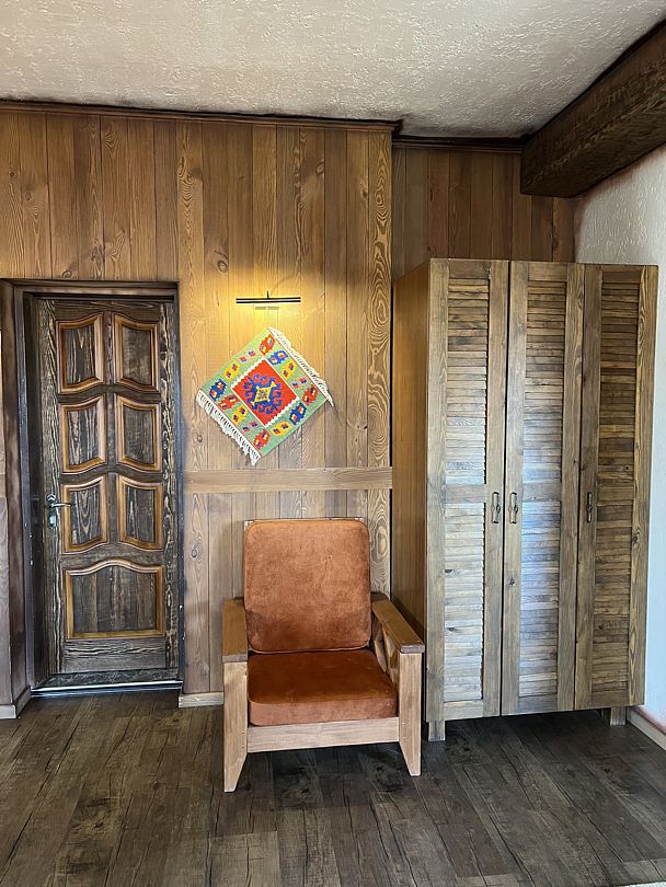 Отделка номеров выполнена с использованием натурального материала — дерева. Пол ковролин. Теплый пол. Номера расположены на 1 этаже.