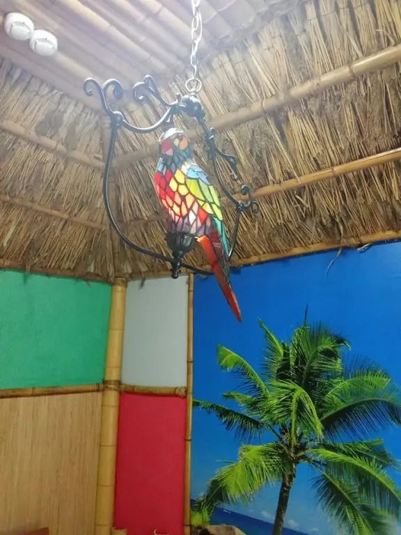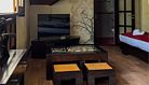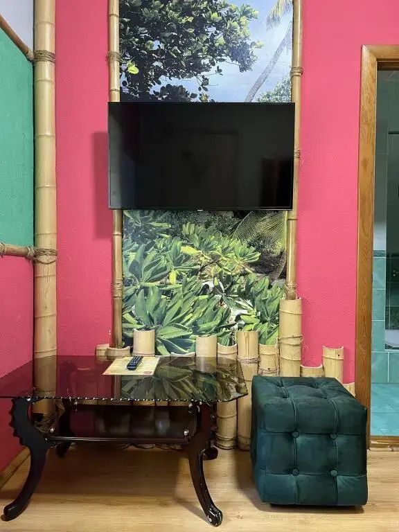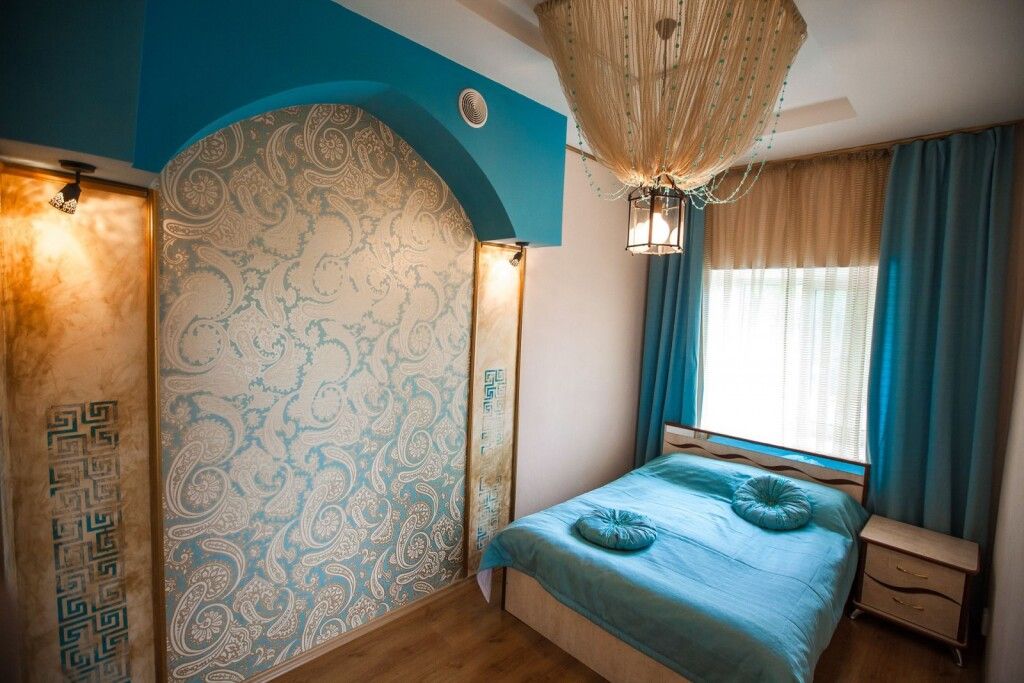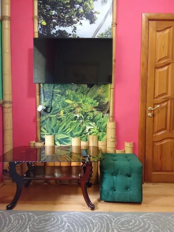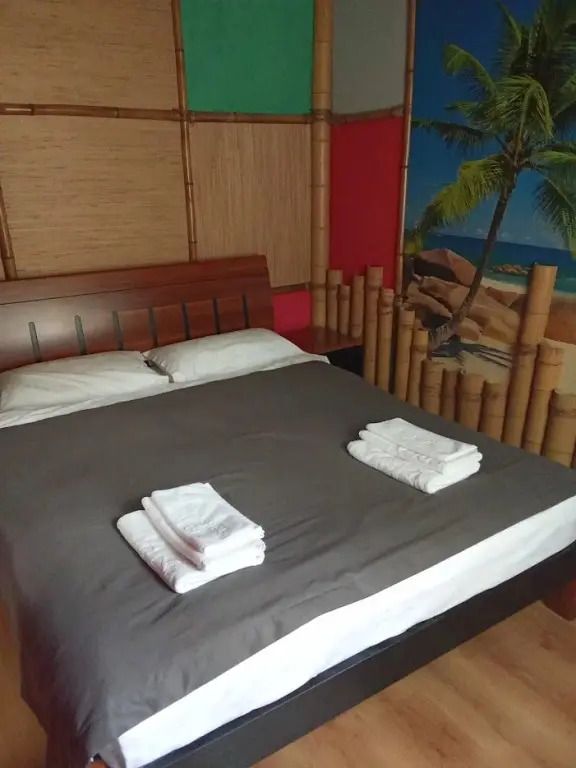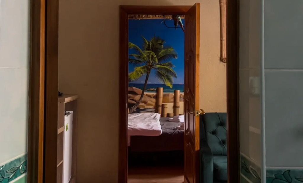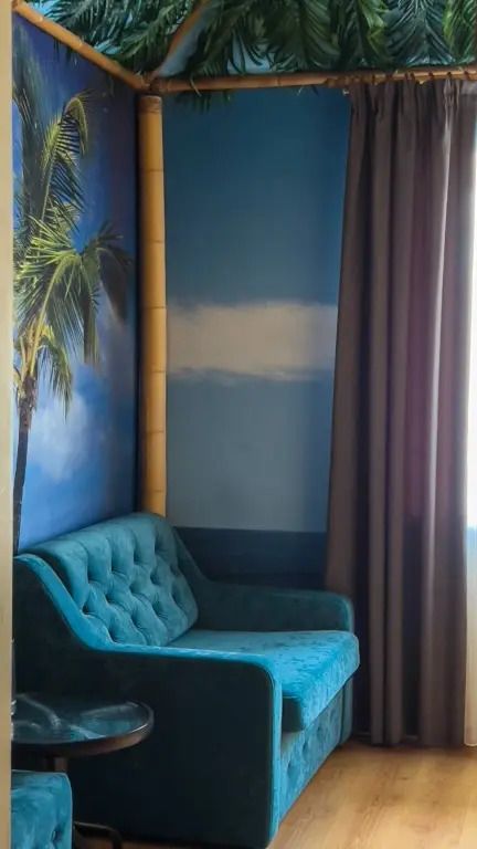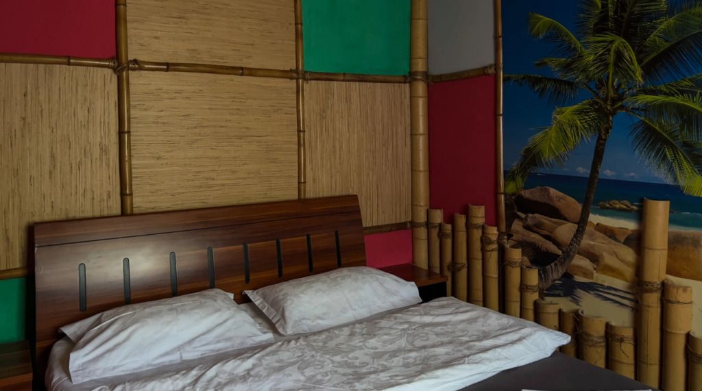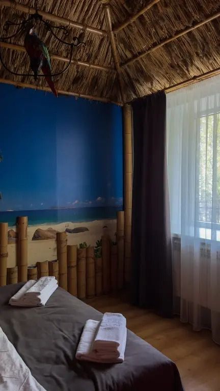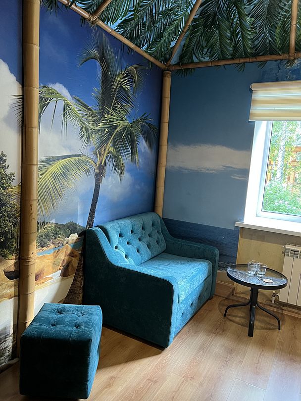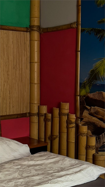 Авторский двухкомнатный номер. В отделке номера использованы фотообои с изображением морского берега, яркие цвета, обои из тростника, натуральный бамбук и камыш.