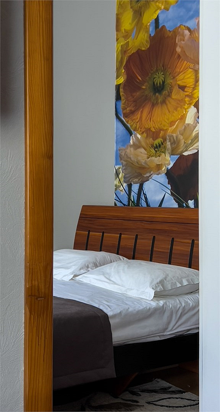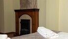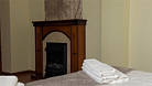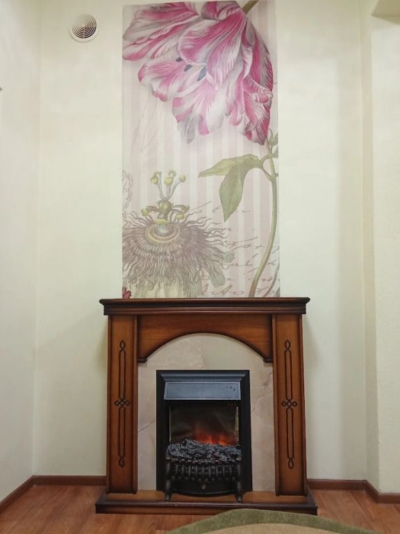 Однокомнатный номер с электрокамином. В интерьере цветочные фотообои, камин.