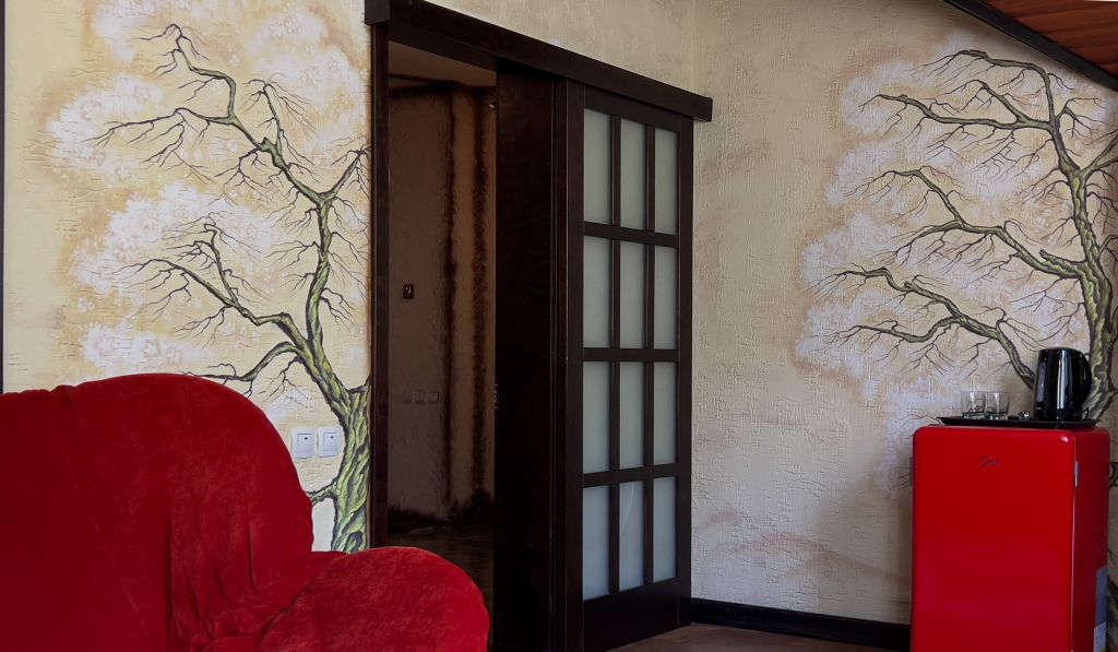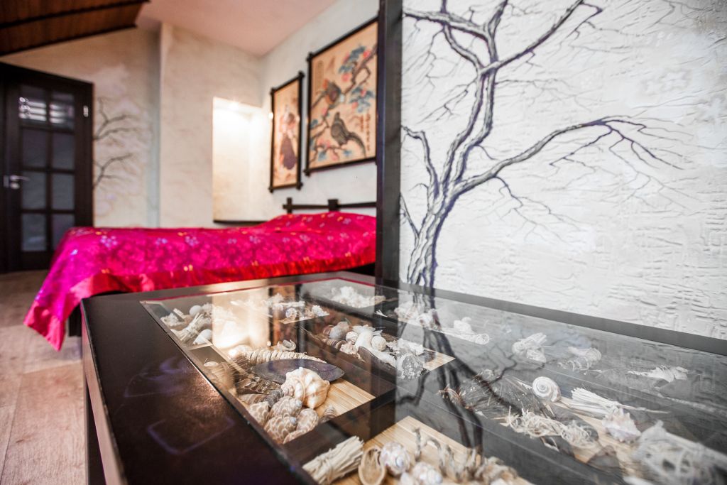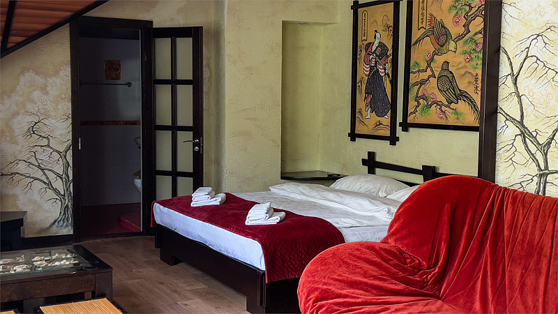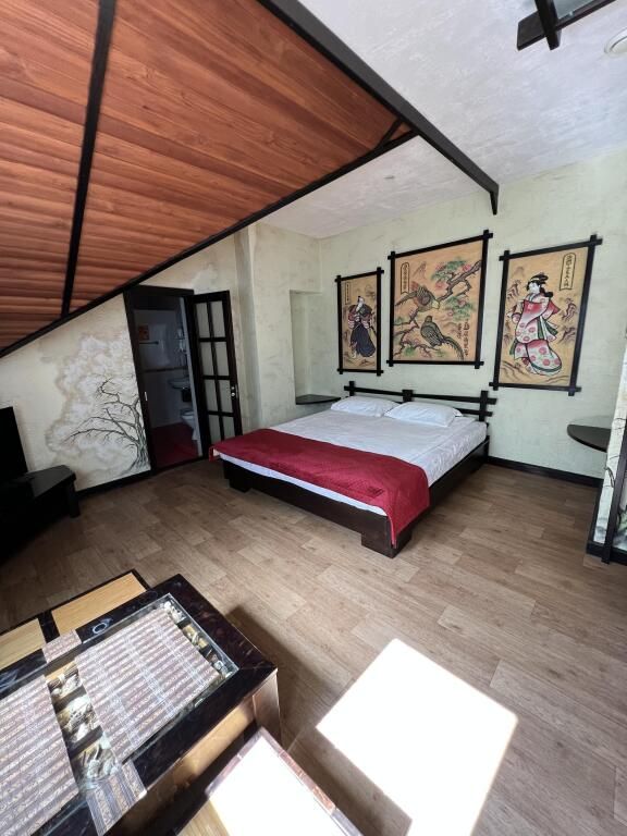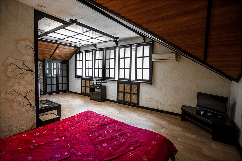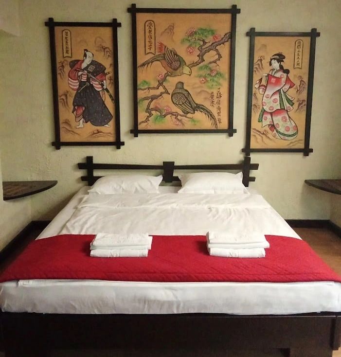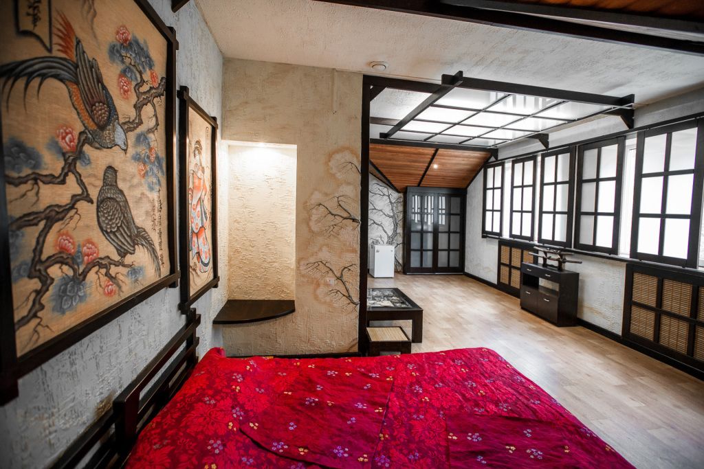 Авторский номер в японском стиле с цветущей сакурой на стенах, японскими картинами и самурайскими мечами. Возможное размещение 4 человека.
