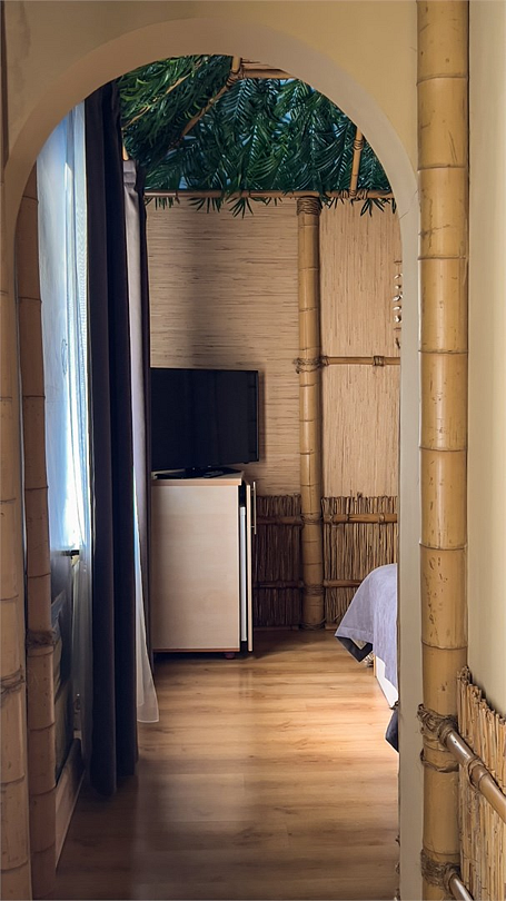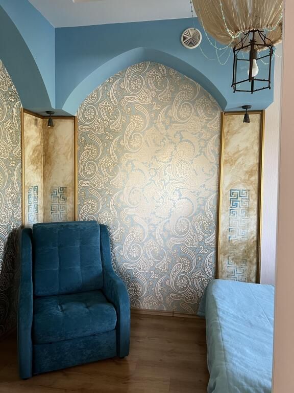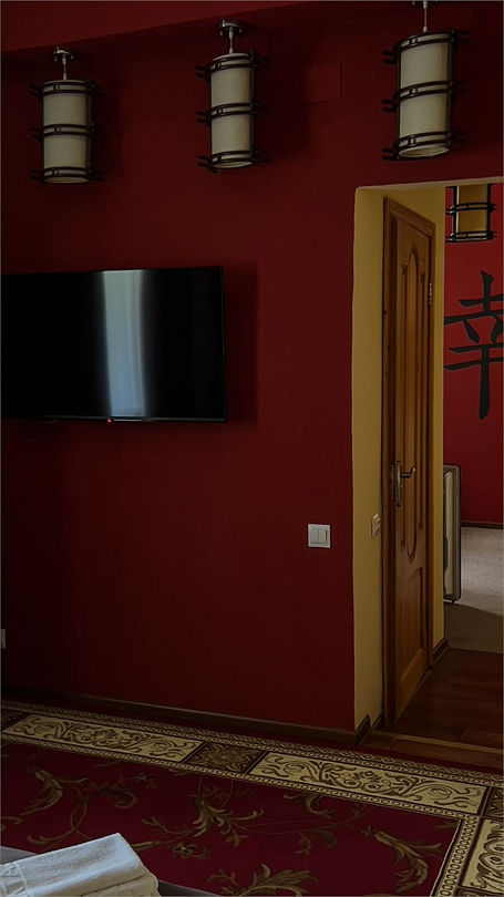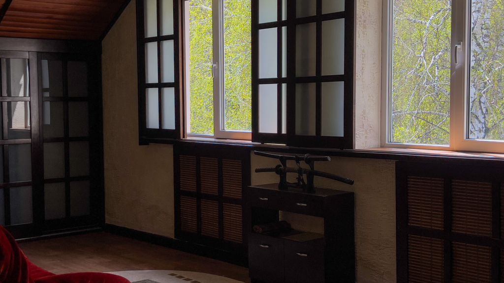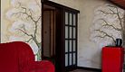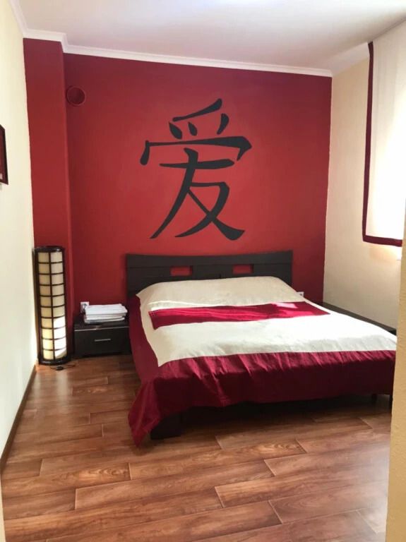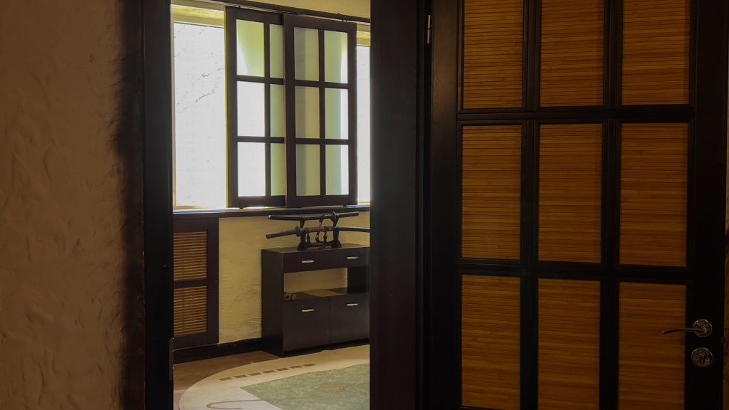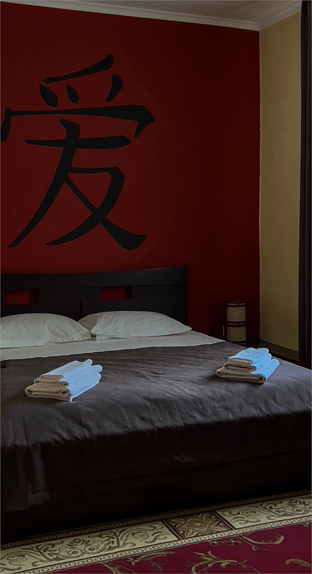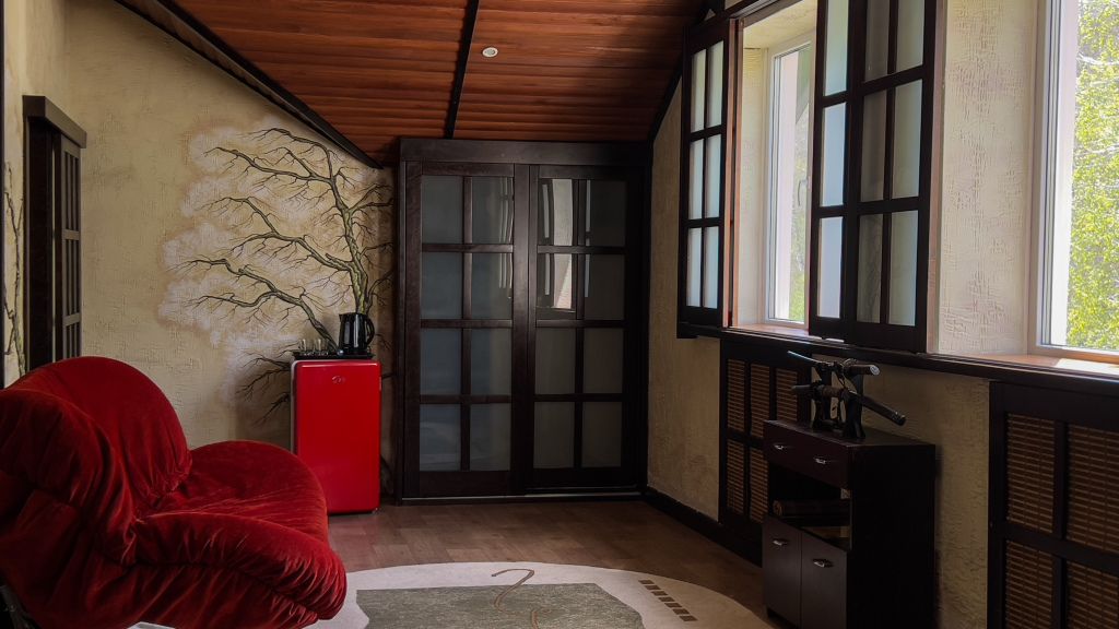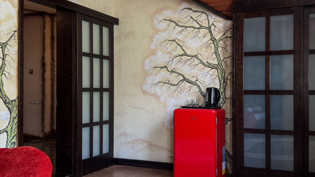 Авторский номер в японском стиле с цветущей сакурой на стенах, японскими картинами и самурайскими мечами. Возможное размещение 4 человека.