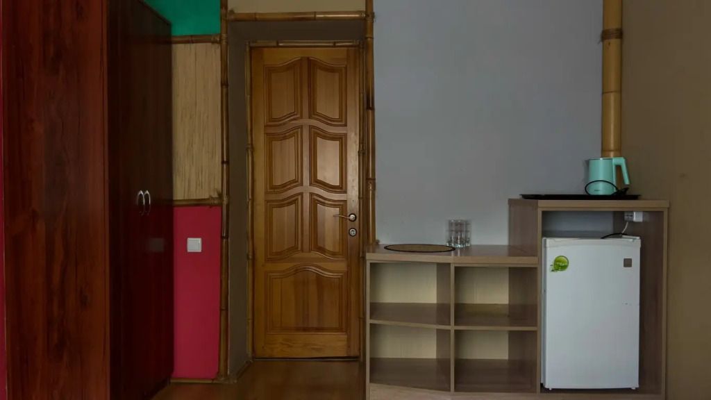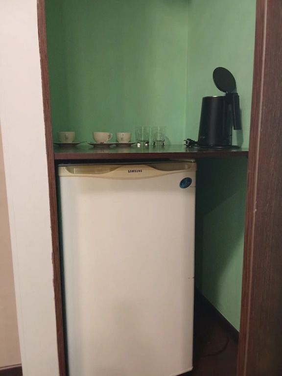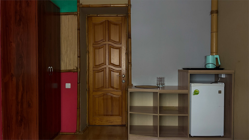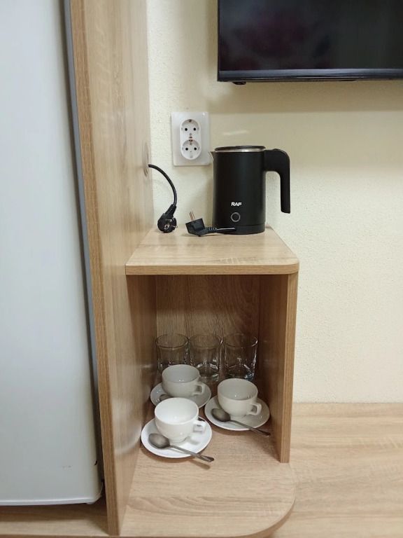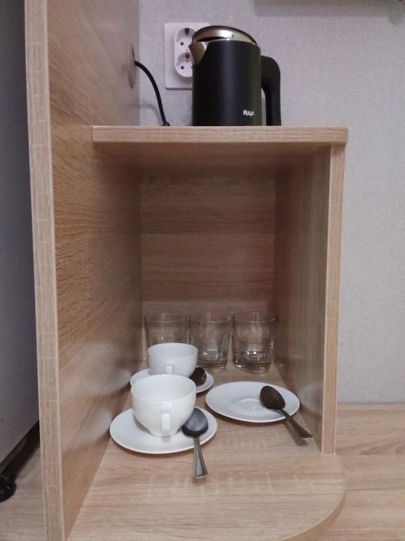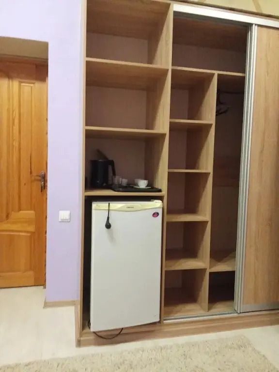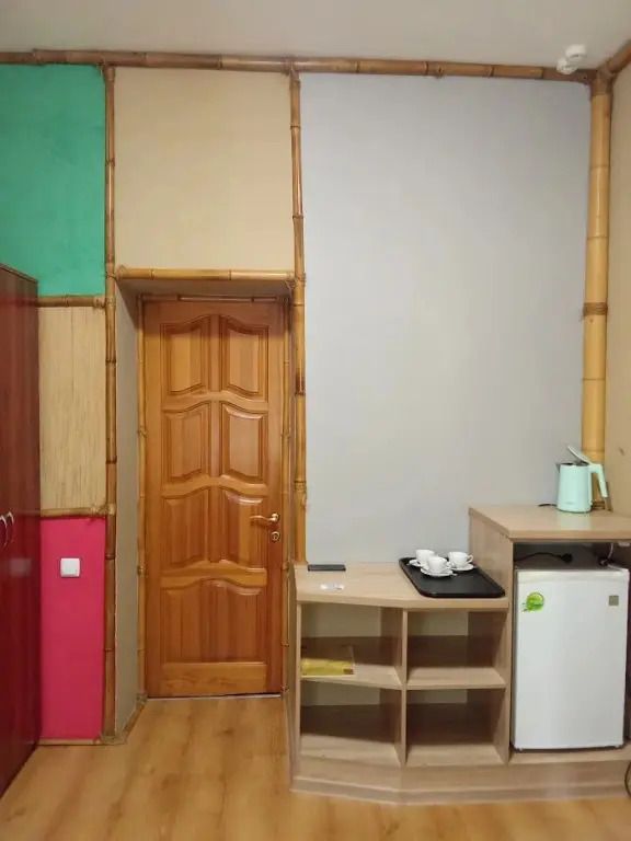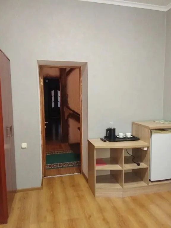 Межкомнатной двери нет. В номере двуспальная кровать, диван 140 см. Чайная комната — в холле на 2 этаже.