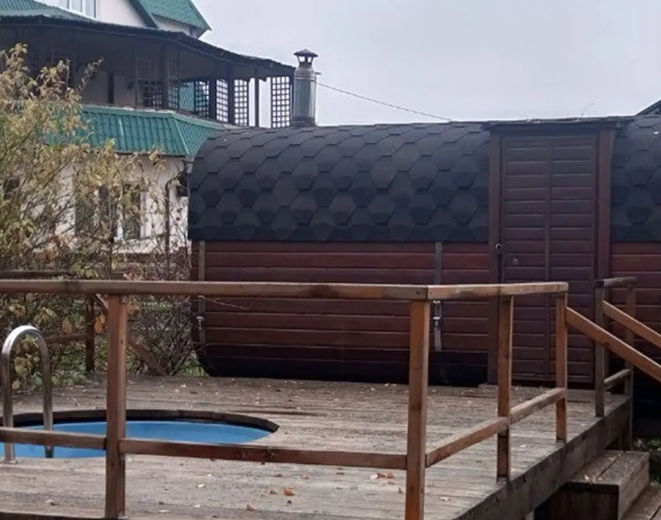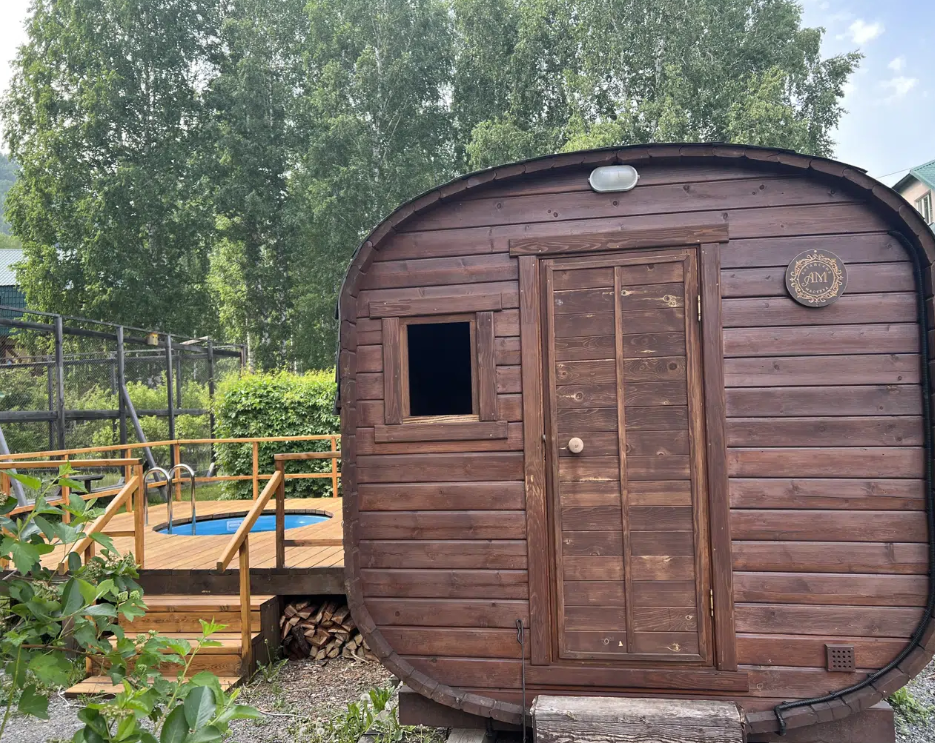 Баня-бочка на дровах с купелью. В комплектацию посещения входят простыни, войлочные изделия. Минимальное время заказа 2 часа. Комфортное размещение до 8-ми человек.