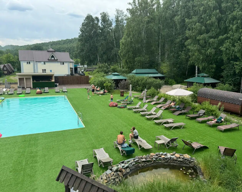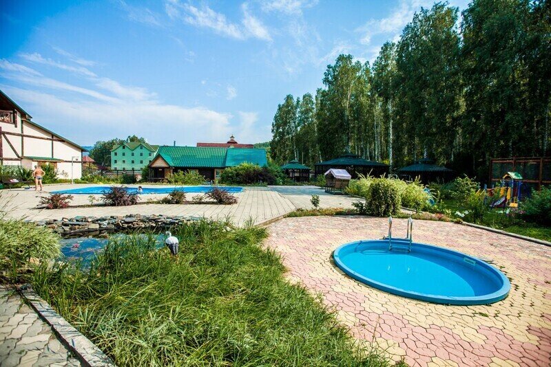 На территории есть открытый бассейн с подогревом, бассейн для малышей до четырёх лет, бар у бассейна, ресторан, зона для барбекю, беседки, детская юрта, спортивные и игровые площадки, а также бесплатная парковка.