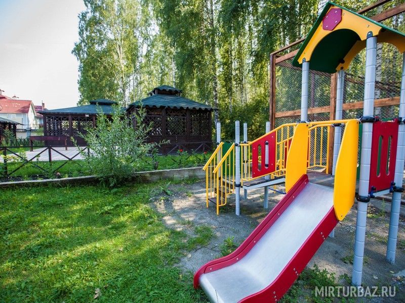 Для детей оборудована игровая площадка с горками, качелями и песочницей.