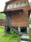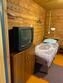 На первом уровне: комната с мягкой мебелью, комод, телевизор, чайник, туалет, умывальник, балкон с видом на пруд.