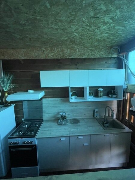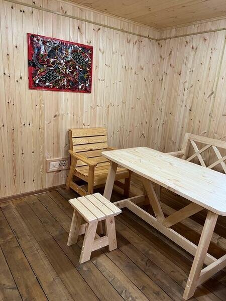 Из кедра, благоустроенная (с отдельным санузлом). Комфортная, современная, безопасная. Алтайский чай и мёд в подарок.