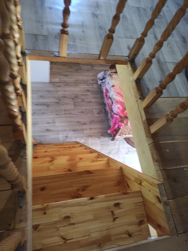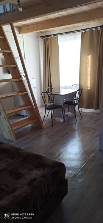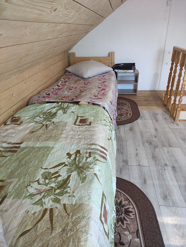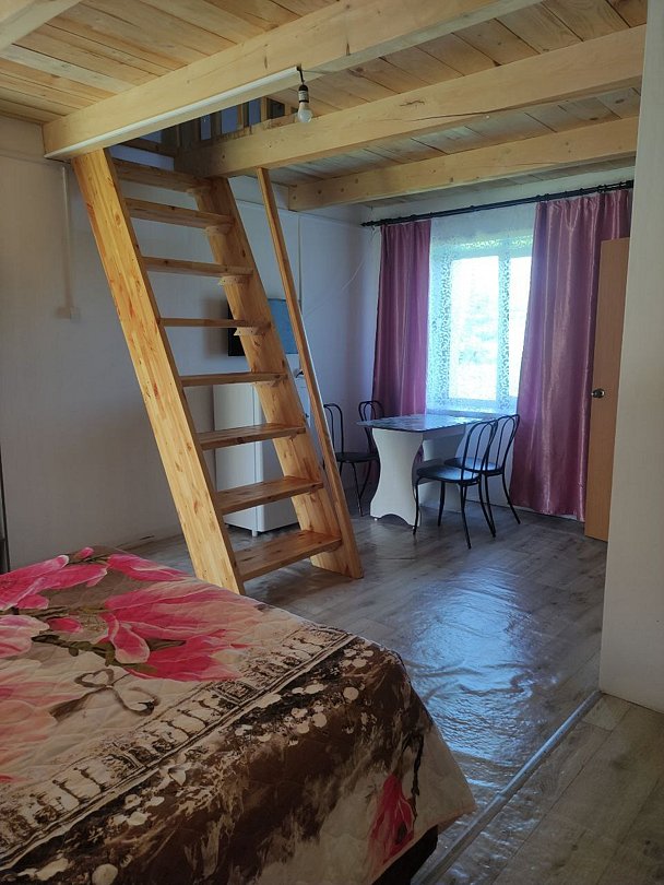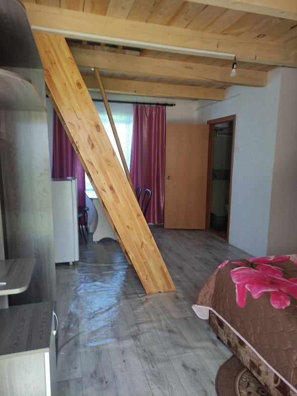 Полулюкс с мансардой представляет собой двухэтажный номер с изолированным входом. Номер оборудован собственным душем и туалетом. В номере есть холодильник, телевизор, обеденный стул, кухонный гарнитур, прихожая, шкаф и тумбочки.