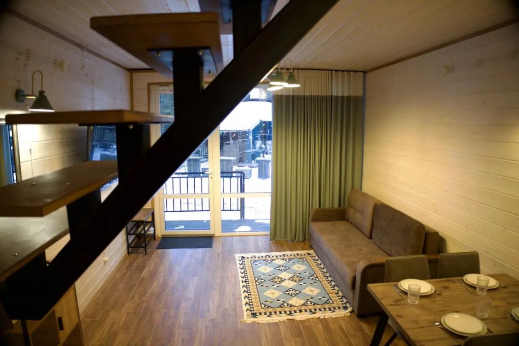 Двухэтажный коттедж с двумя спальнями и кухней.