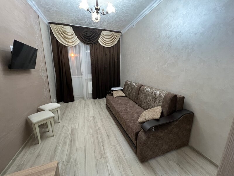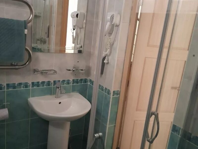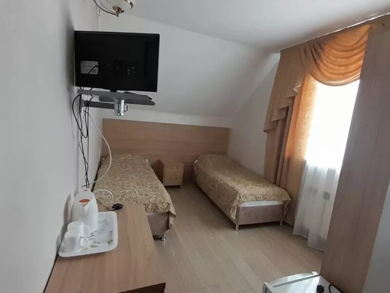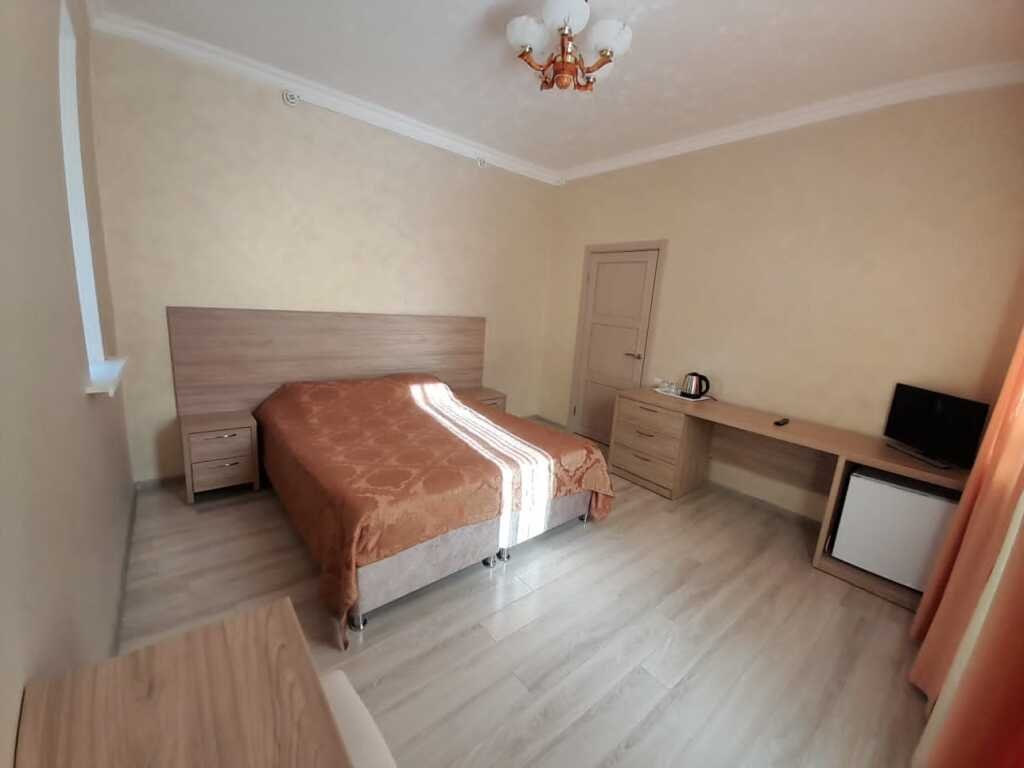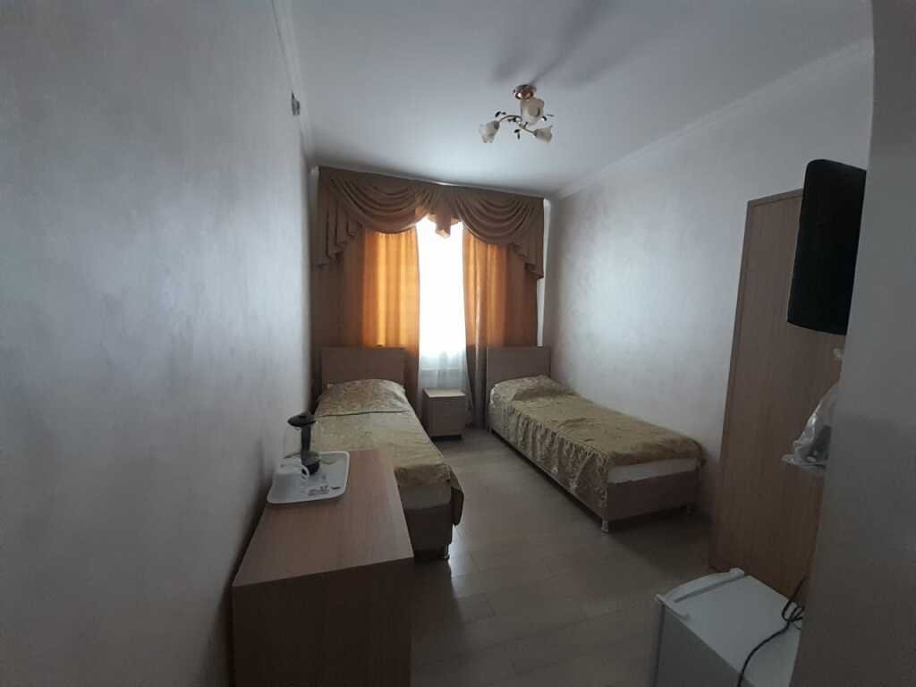 Однокомнатный номер: 2 кровати, шкаф для вещей, 2 тумбочки, зеркало, журнальный стол, ТВ, диван-кровать на двоих, комод с зеркалом, санузел (душевая кабина), холодильник. Есть номера с балконом.
