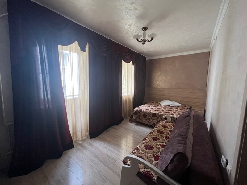 Вместительный номер со всеми удобствами: Wi-Fi, телевизор, четыре односпальные кровати, диван. Шикарный интерьер с декоративными элементами, современной мебелью. Рядом с отелем есть удобная парковка. Из окна открывается прекрасный вид на горы, местные достопримечательности. В номере созданы все условия для комфортного проживания, регулярно проводится уборка. В ванной находятся полотенца и гигиенические принадлежности. В номере есть тумбочки для хранения вещей, шкаф для одежды, компактный столик.