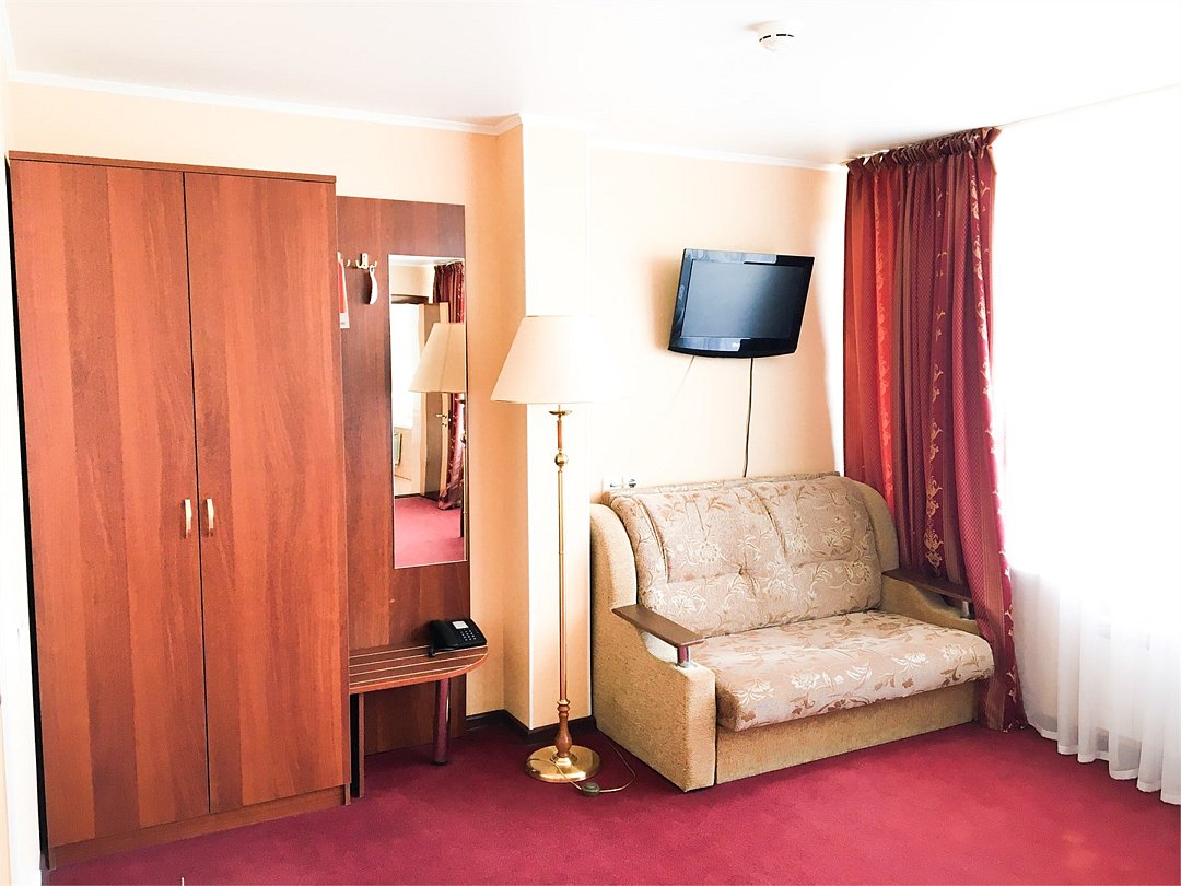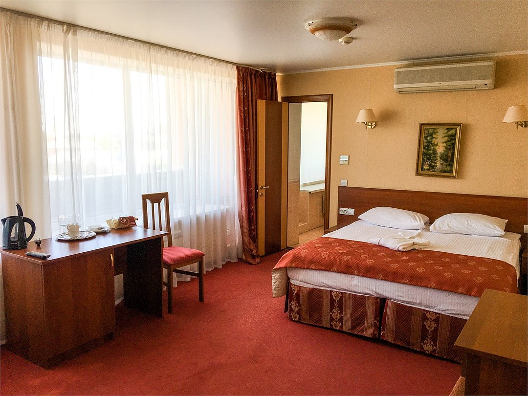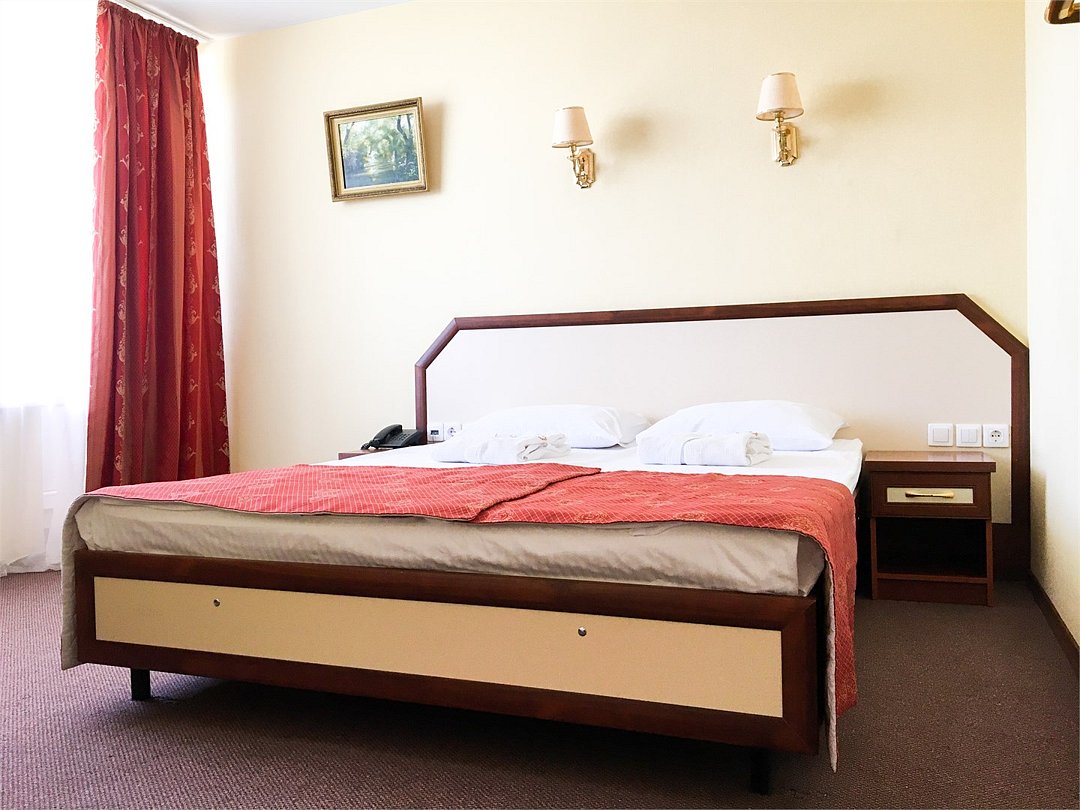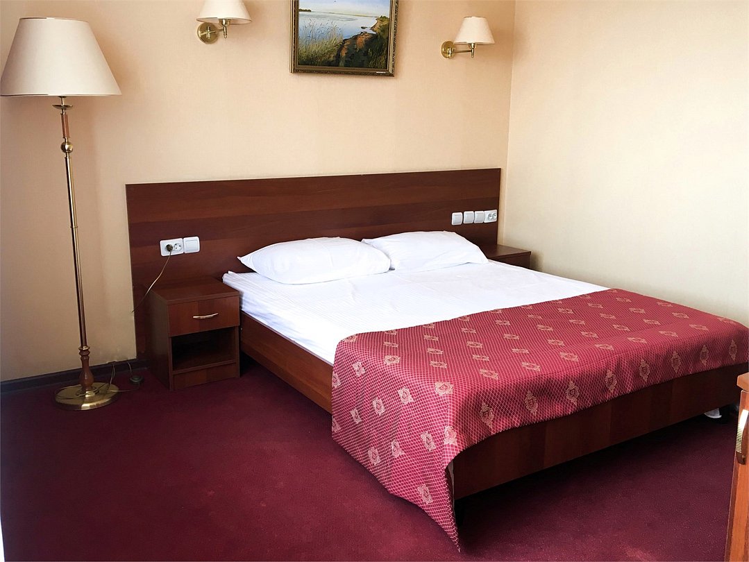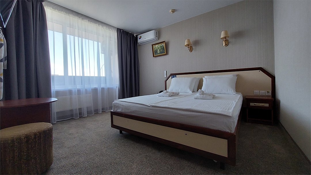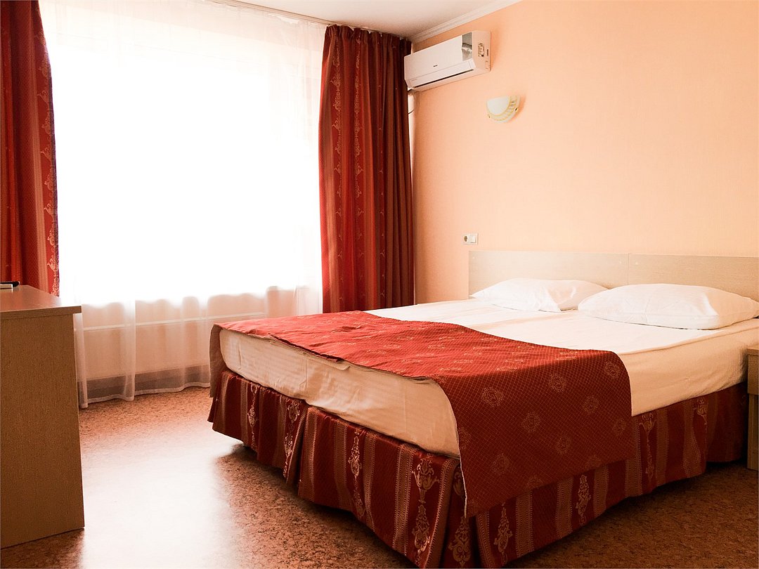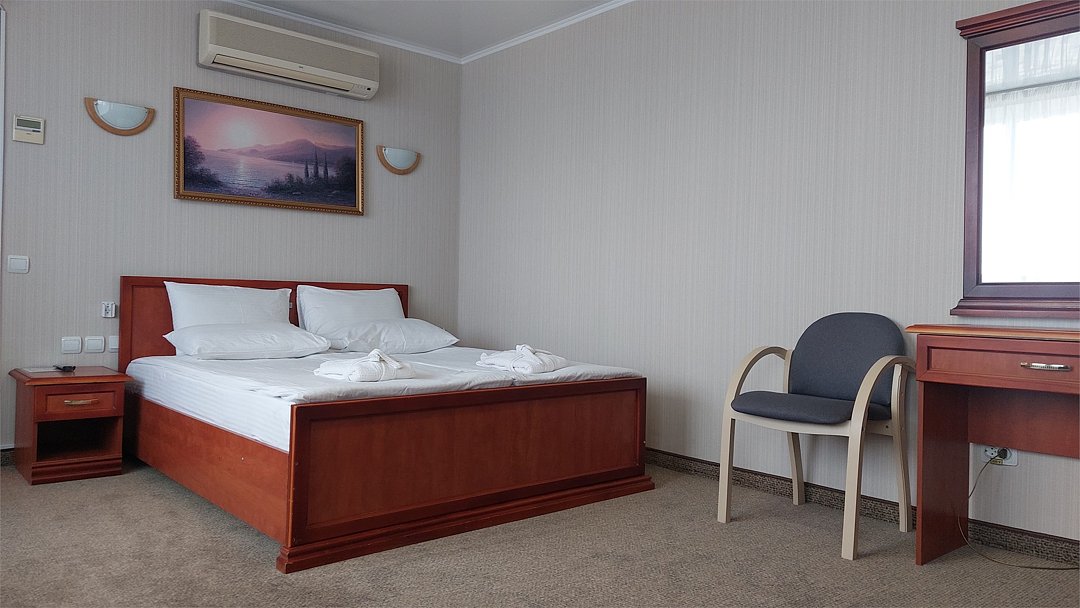 Площадь номера 18 кв.м. Размещение в номере – до 2 чел. В прихожей: встроенный шкаф, чемоданница, зеркало. Комната: двуспальная кровать (160*200), прикроватные тумбочки, столик, телефон, телевизор, холодильник, сейф, кондиционер, бесплатный Wi-Fi. Ванная комната: туалетные принадлежности, комплект полотенец, полотенцесушитель, бритвенный набор, фен, тапочки(по запросу). Номера для некурящих.Услуги и удобства