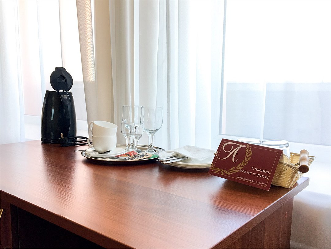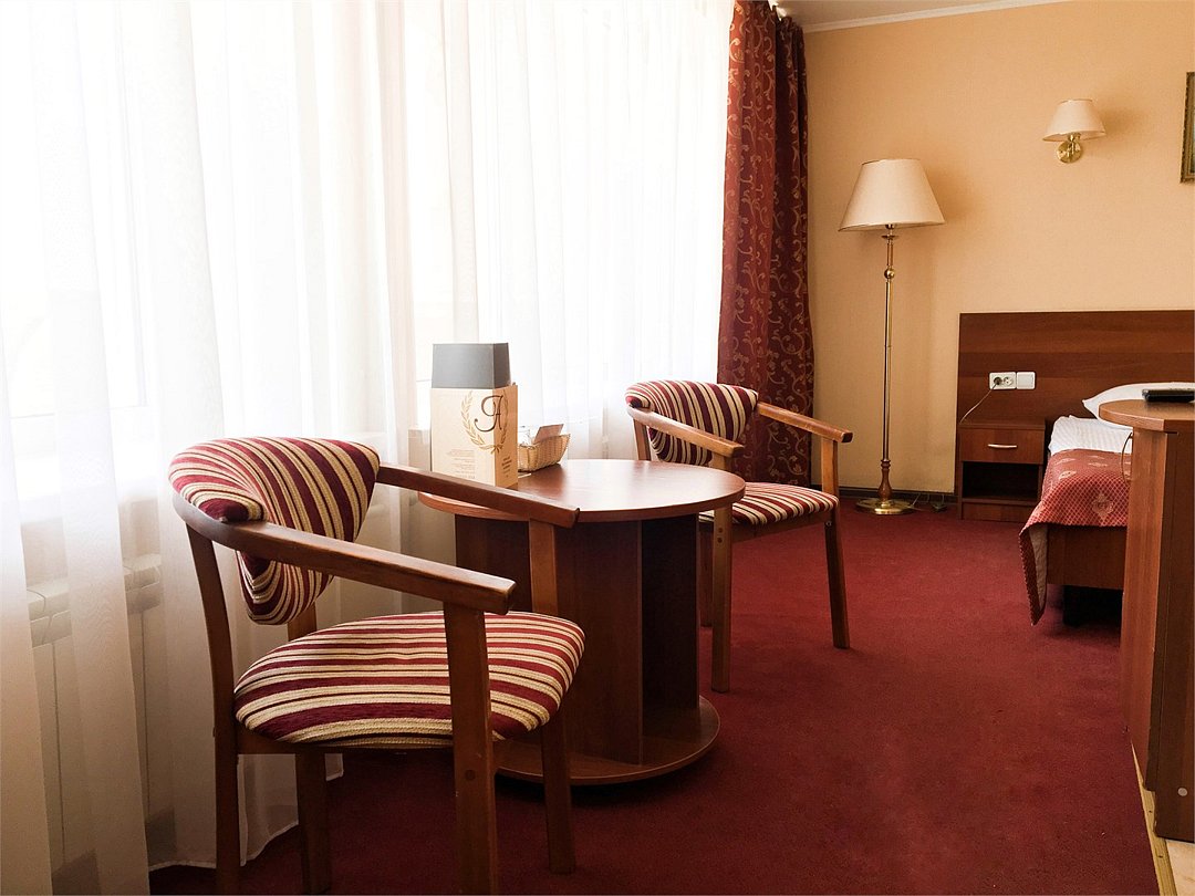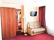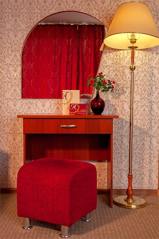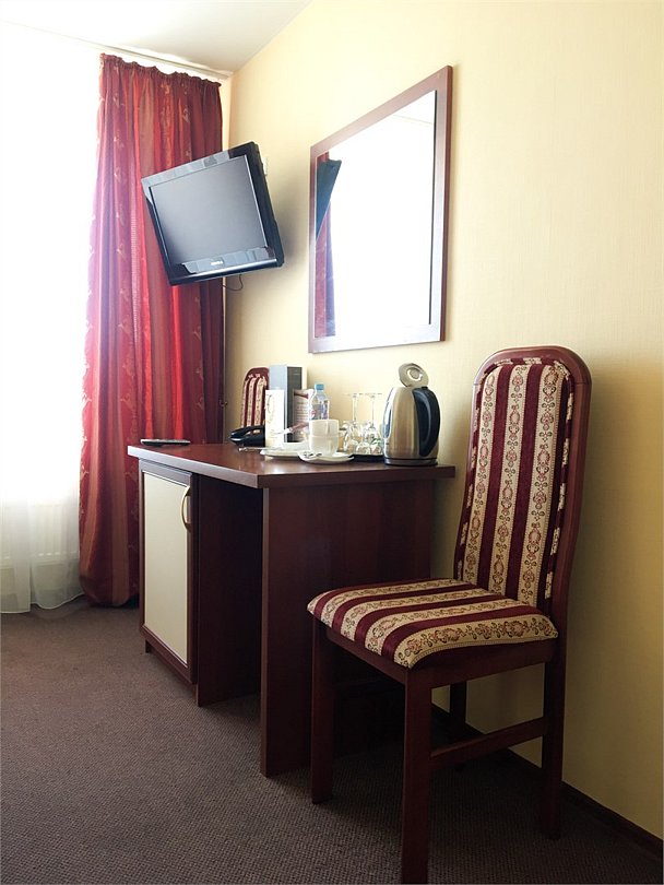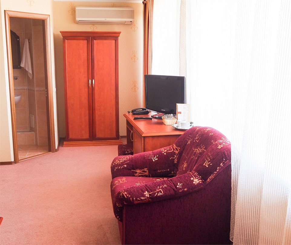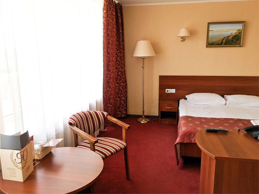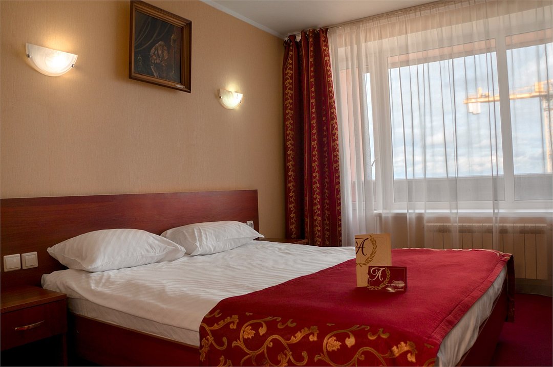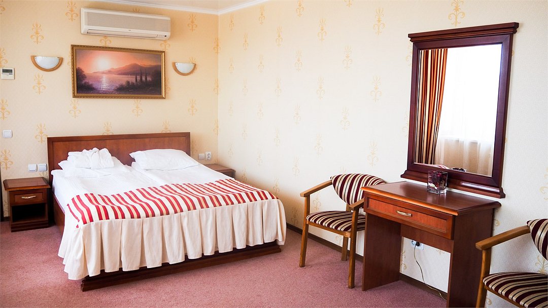 Площадь номера 18 кв.м. Размещение в номере – до 2 чел. В прихожей: встроенный шкаф, чемоданница, зеркало. Комната: двуспальная кровать (160*200), прикроватные тумбочки, столик, телефон, телевизор, холодильник, сейф, кондиционер, бесплатный Wi-Fi. Ванная комната: туалетные принадлежности, комплект полотенец, полотенцесушитель, бритвенный набор, фен, тапочки(по запросу). Номера для некурящих.Услуги и удобства