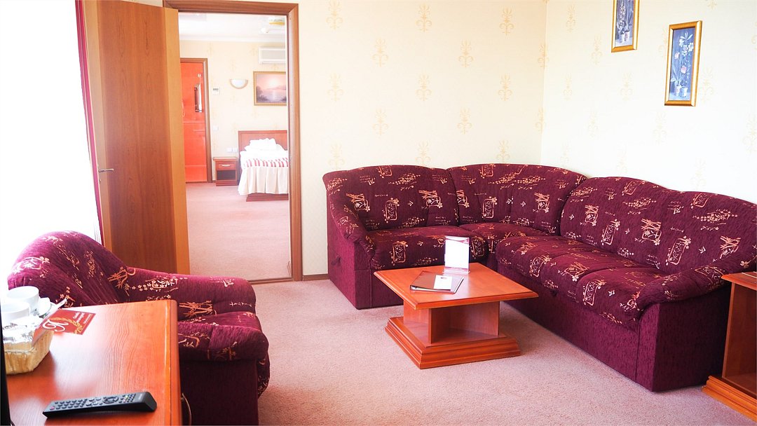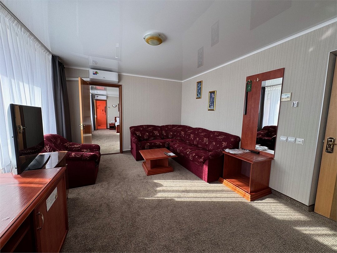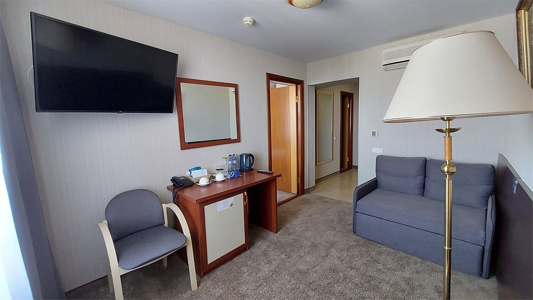 Площадь номера 33 м2. Размещение в номере - до 4 человек . Две большие лоджии Гостиная: шкаф, чемоданница, зеркало, плазменный телевизор, мягкая мебель, журнальный столик, сейф, кондиционер, телефон. Спальня: двуспальная кровать (160*200), прикроватные тумбочки, журнальный столик, плазменный телевизор, кондиционер, телефон, бесплатный Wi-Fi. Ванная комната: туалетные принадлежности, весы, комплект полотенец, полотенцесушитель, бритвенный набор, фен, халат, тапочки.Услуги и удобства
