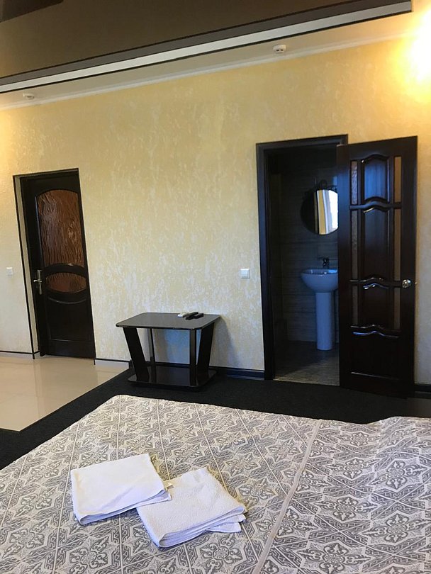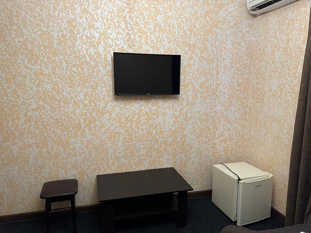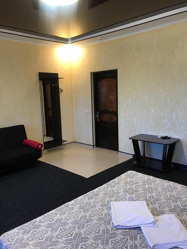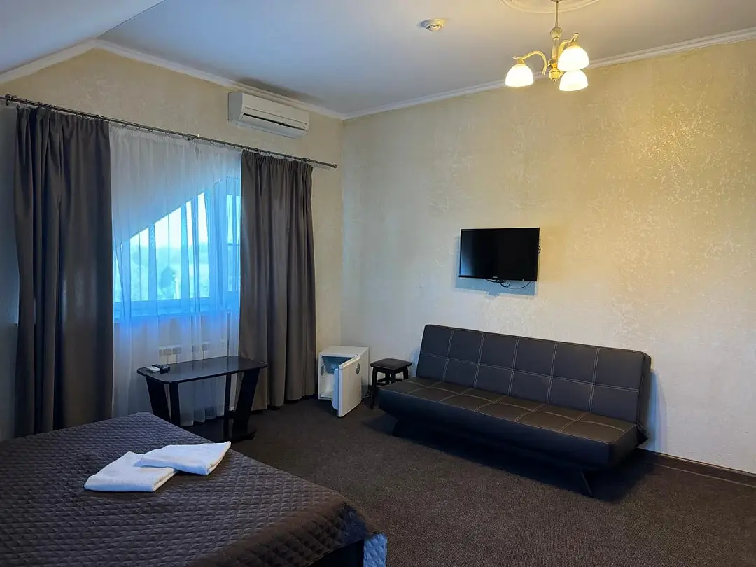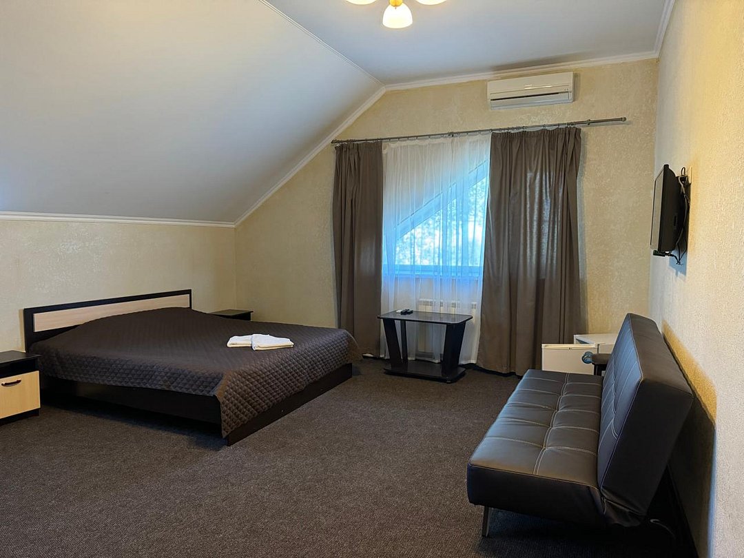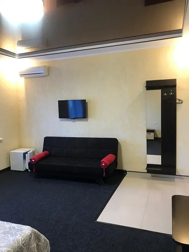 В номере: ЖК-телевизор, кондиционер, одна большая кровать (180×200), диван, холодильник, мебель, собственный санузел с душевой кабиной, туалетные принадлежности.