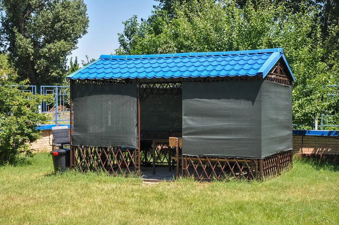 Рядом с каждой беседкой предусмотрена индивидуальная площадка для пикника, оснащенная мангалом. Это позволяет гостям комфортно разместиться и насладиться отдыхом в уютной обстановке, идеально подходящей для небольших компаний.