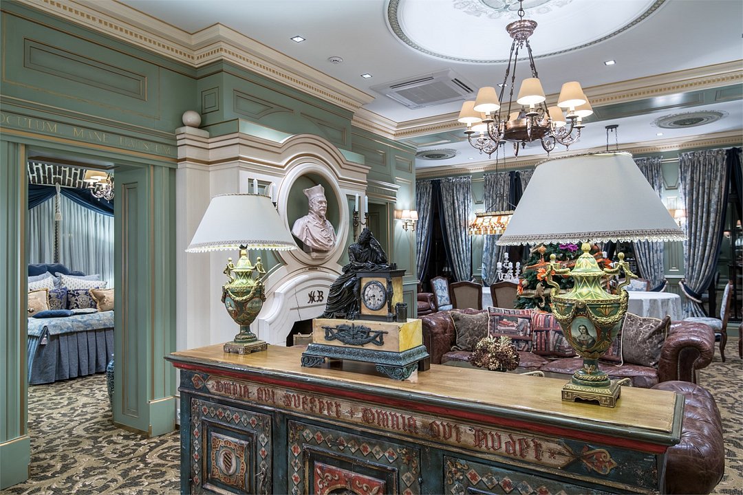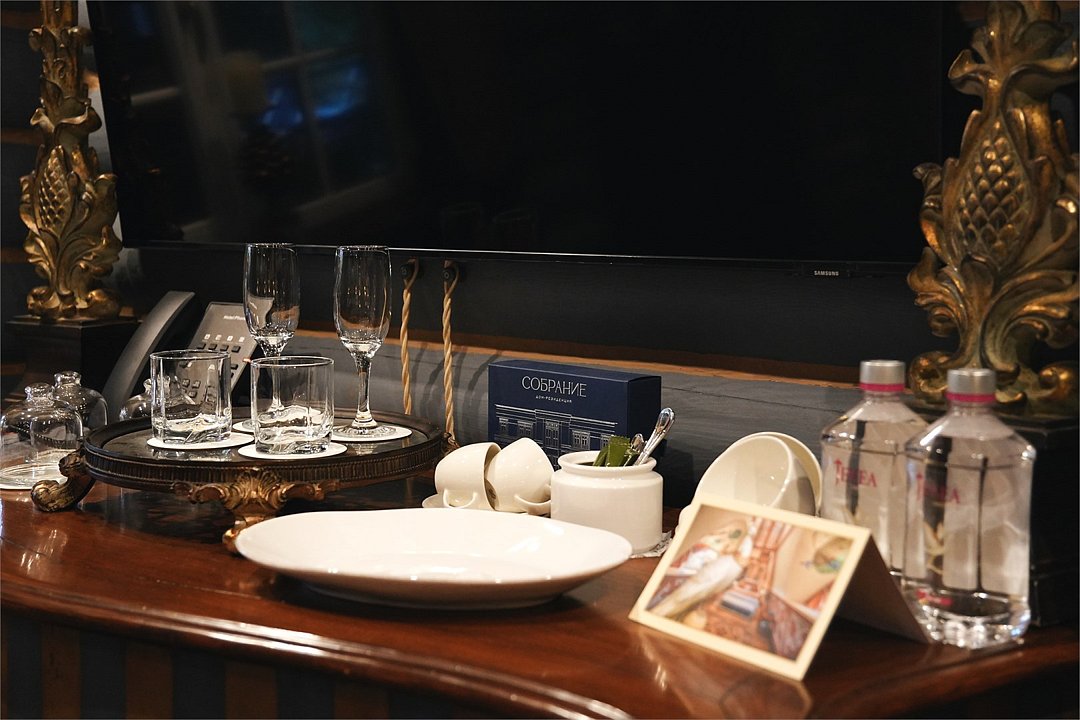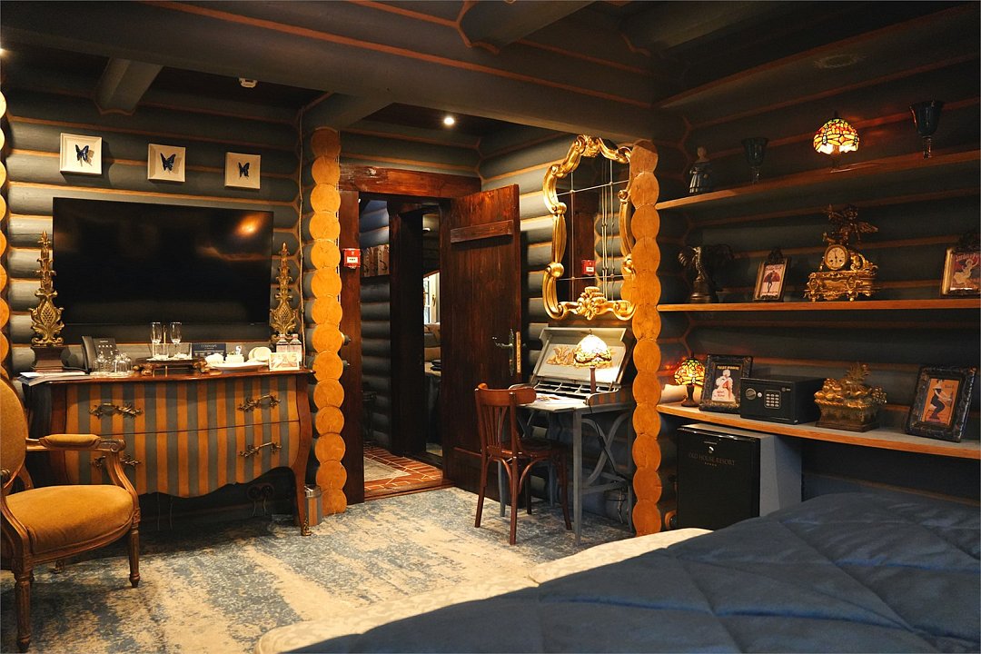 два телевизора, Wi-Fi, кондиционер, фен, кофемашина, ванная комната, душевая кабина, ванна, теплый пол, халаты, банные полотенца, тапочки, косметические средства, кровать «King size», шкаф для одежды, вешалки, журнальный столик, зеркало, комод, ковер, эксклюзивная мебель, две комнаты, мини-бар, письменные принадлежности, свежая пресса, обслуживание номеров, информационная карта, меню, сейф, унитаз, косметическое зеркало, питьевая вода, отопление, отдельный вход в номер, плиточное покрытие, кресло, раздельный санузел, вид во двор, высокие потолки, меню подушек, стаканы, стул, стол, тумба, туалетные средства, санузел на этаже, туалет, вид на парк, диван-кровать, внутренний телефон, москитная сетка, номер для некурящих, общественный бассейн, неограниченное посещение СПА, онлайн-регистрация до заезда, фитнес-зона, антикварная мебель, фумигатор, уборка номера, набор для приготовления чая и кофе, услуги прачечной (платно), бутилированная вода, мини-бар (платно), можно с питомцамиВ номере