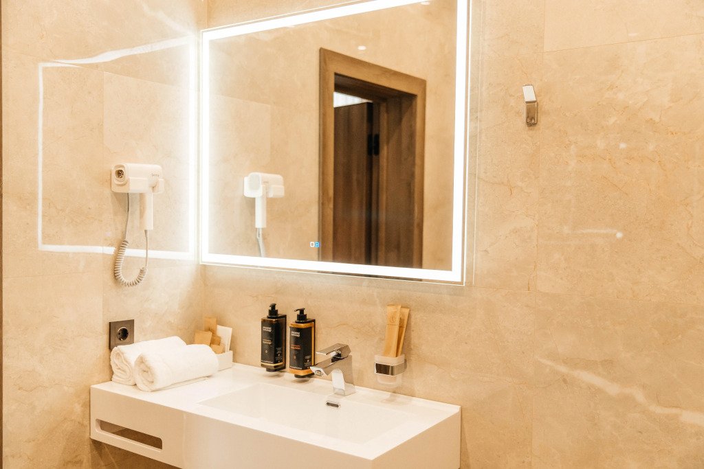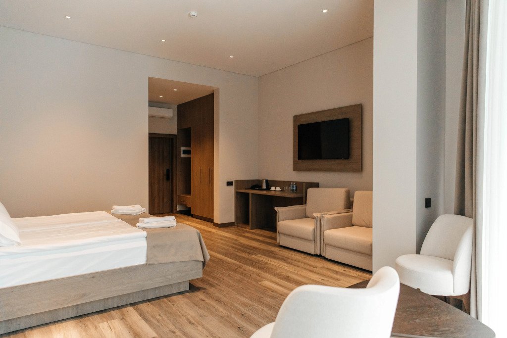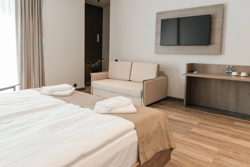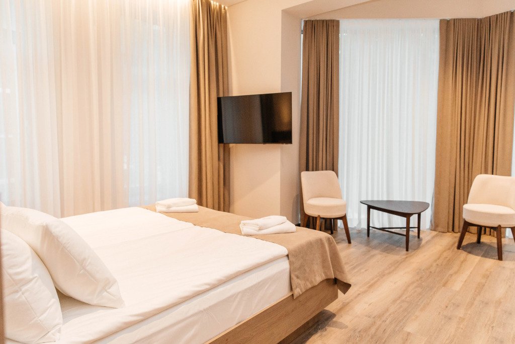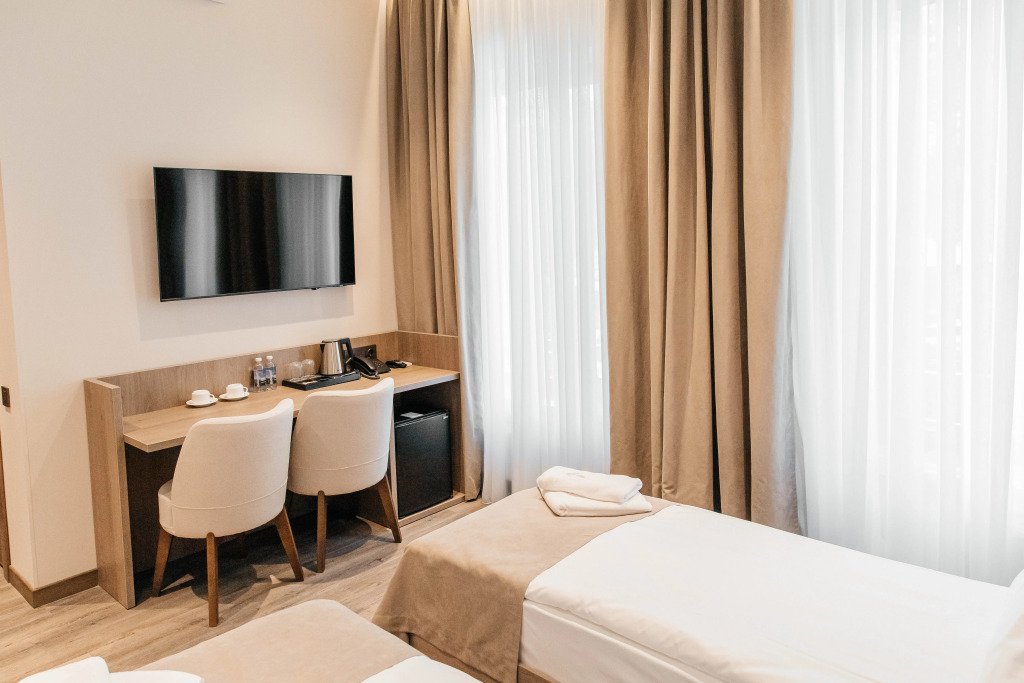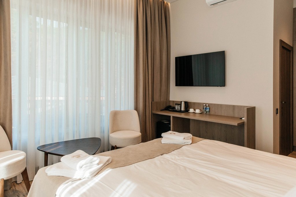 В номере вы найдёте телевизор. Оснащение зависит от выбранной категории номера.