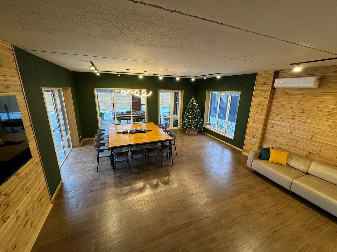 Большая красивая гостиная на первом этаже способна принять до 40 гостей. В гостиной установлен большой smartТВ с возможностью подключения через Bluetooth и саундбар. Больше не нужно сдерживать себя, безудержным танцам быть!