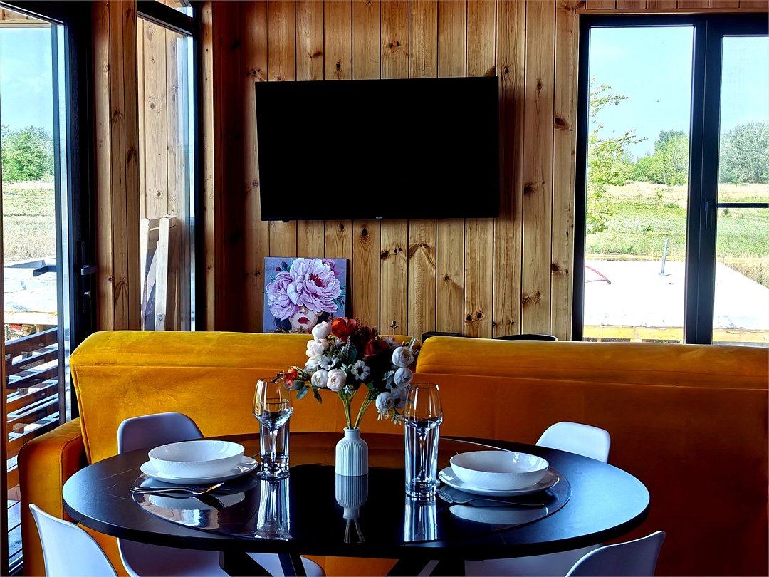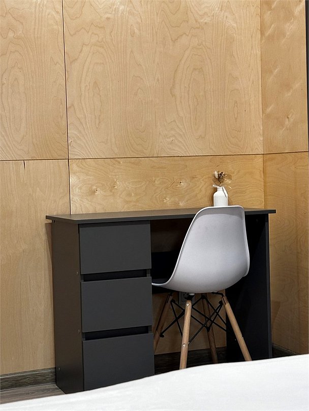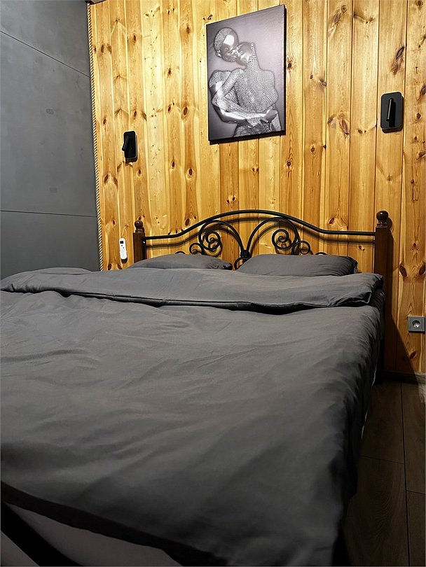 Небольшая спальня, двуспальная кровать с ортопедическим матрасом и мягким постельным бельем, уютные пледы и приглушённый свет для полноценного отдыха. Гостиная зона — мягкий диван с декоративными подушками, деревянный стол для завтраков и вечерних чаепитий.