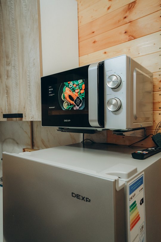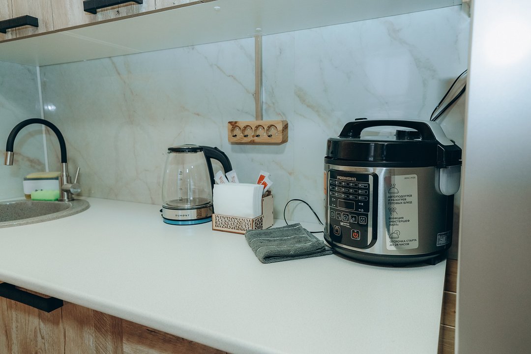 Не нужно беспокоиться о приготовлении еды, ведь здесь есть уютная кухонная зона со всем необходимым: мультиварка, посуда, холодильник, микроволнлвая печь - все для того, чтобы вы могли готовить свои любимые блюда.