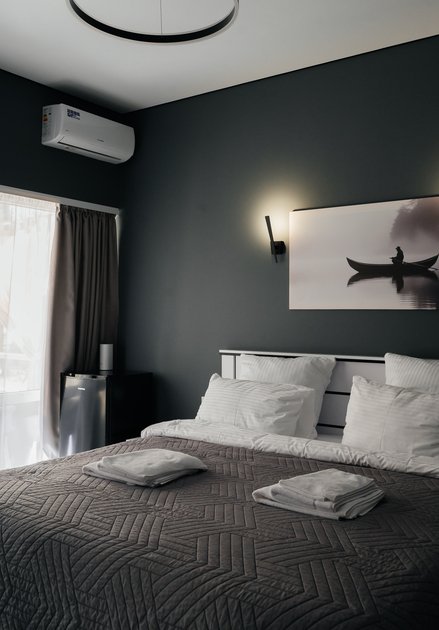 В однокомнатном номере вы найдете все для вашего удобства: кровать king-size с ортопедическим матрасом, холодильник, чайник, микроволновую печь, чайный и кофейный набор. Постельное белье премиум-качества, полотенца, ванные принадлежности, тапочки, фен. Телевизор Яндекс тв, wi-fi, кондиционер. У каждого номера своя большая терраса с садовой мебелью и мангальная зона.