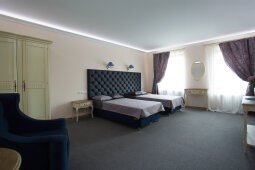 телевизор, Wi-Fi, интернет, светильник, биде, две односпальные или большая двуспальная кровать, стулья, гардеробная, вешалки, багажная тумба, зеркало, минеральная вода, ковровое покрытие, отопление, душ, вид на город, кресло, стаканы, стол, туалетные средства, туалет, мини-холодильник, номер для некурящихВ номере