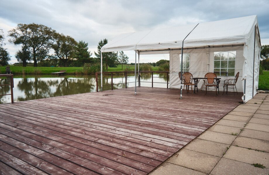 Шатёр с мангалом на пирсе пруда