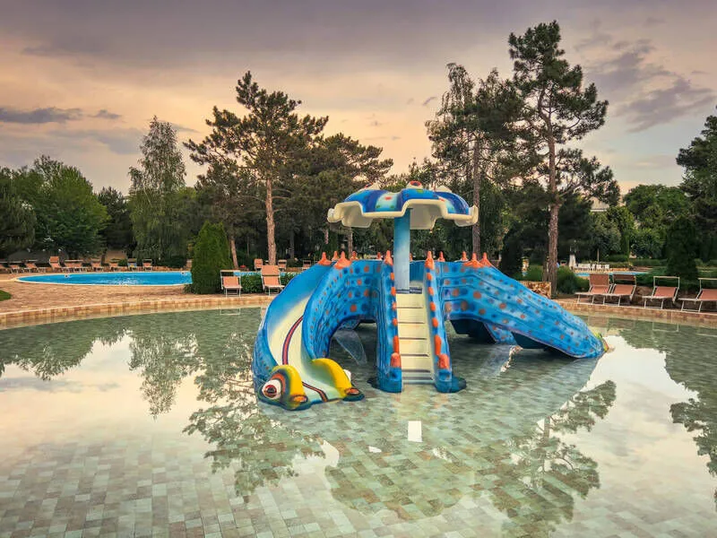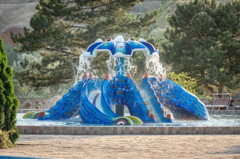 Отель «Рассветы Закаты» заботится и о самых юных гостях. Рядом с корпусами расположен детский бассейн, в котором находится уникальная водная горка в форме осьминога. Этот веселый и безопасный аттракцион дает юным посетителям возможность испытать восторг от водных развлечений, находясь под присмотром родителей.