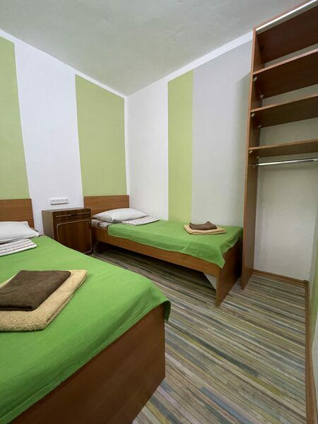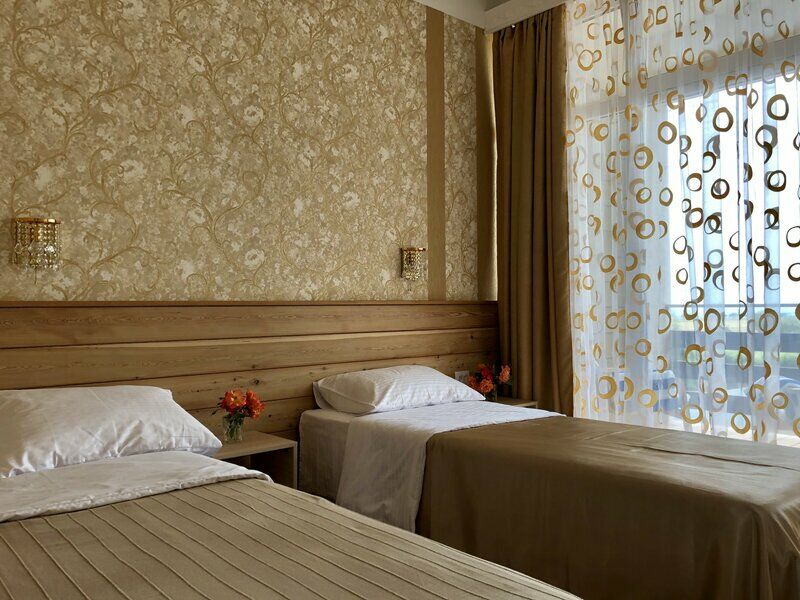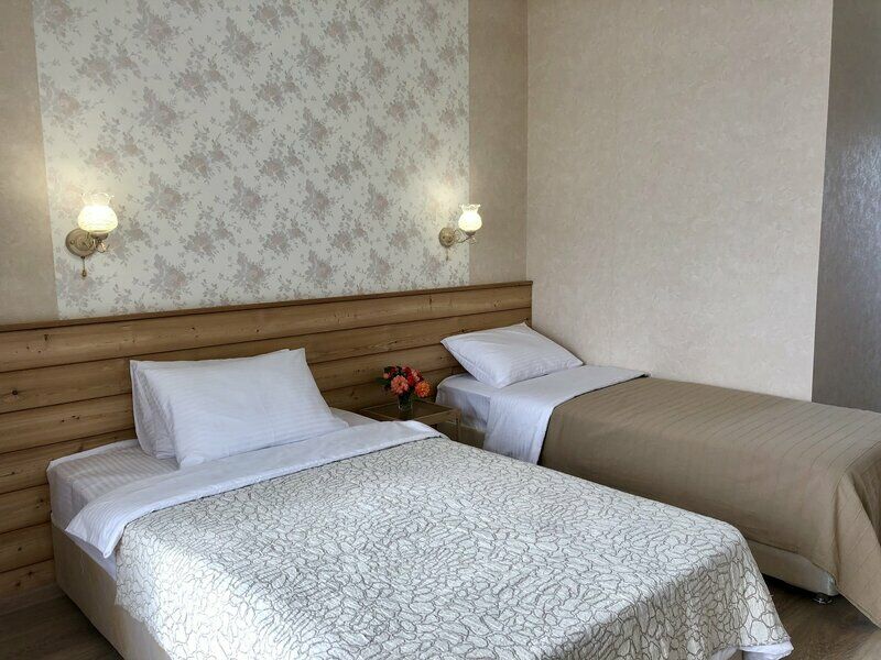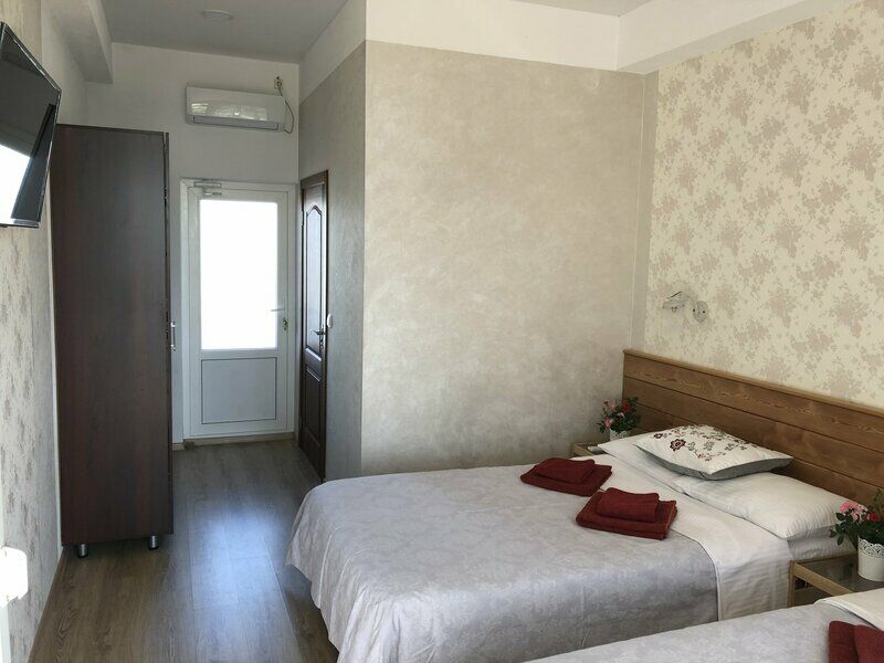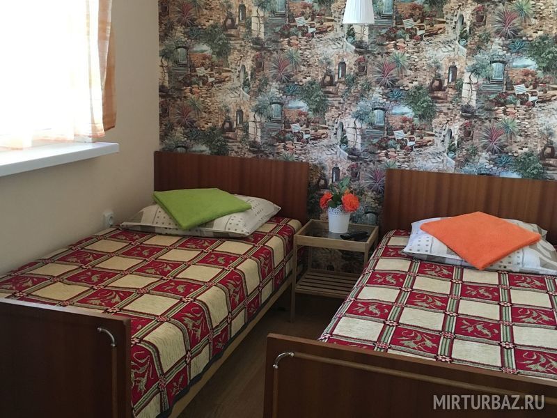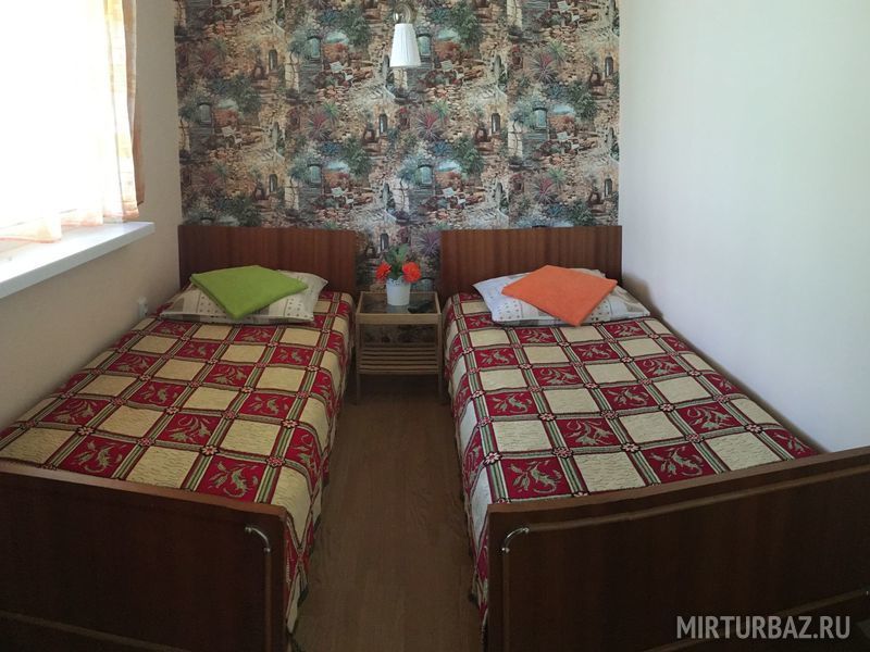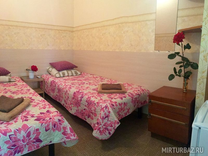 Двухместный номер с террасой. Площадь номера около 10 м кв. Номер имеет отдельный вход, собственную террасу с мебелью. В номере есть санузел ( душ, умывальник, туалет), сейф, холодильник, шкаф, тумбочка, жк тв. Спальные места : две односпальные кровати (по желанию можно сдвинуть).