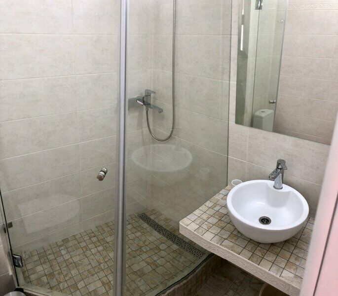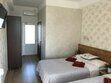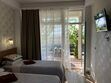 Трехместный номер с террасой. Площадь номера ( комната + санузел) 15-18 м.кв. Номер имеет отдельный вход, собственную террасу с мебелью. В номере санузел ( душ, умывальник, туалет), сейф, холодильник, шкаф, тумбочка, жк тв Спальные места : двуспальная кровать (140 см) + тахта (110 см) или : двуспальная кровать (140 см) + односпальная (80-90 см). Некоторые номера этого типа оснащены кондиционерами (где необходимо).